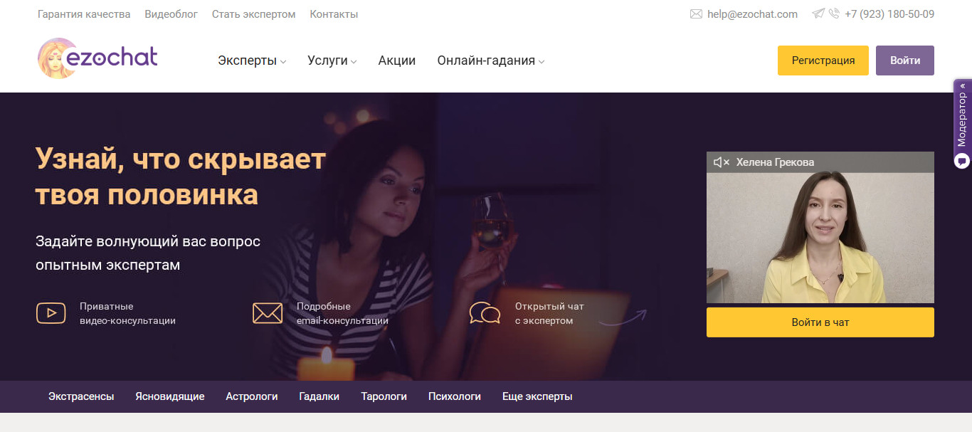 - Что предлагают. Сервис объединяет тарологов, астрологов, эзотерических консультантов. У каждой анкеты видеоприветствие, блок «карта дня» и рейтинг.