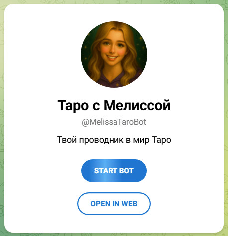 - MelissaTaroBot — мгновенный онлайн расклад Таро бесплатно с быстрой расшифровкой карт.