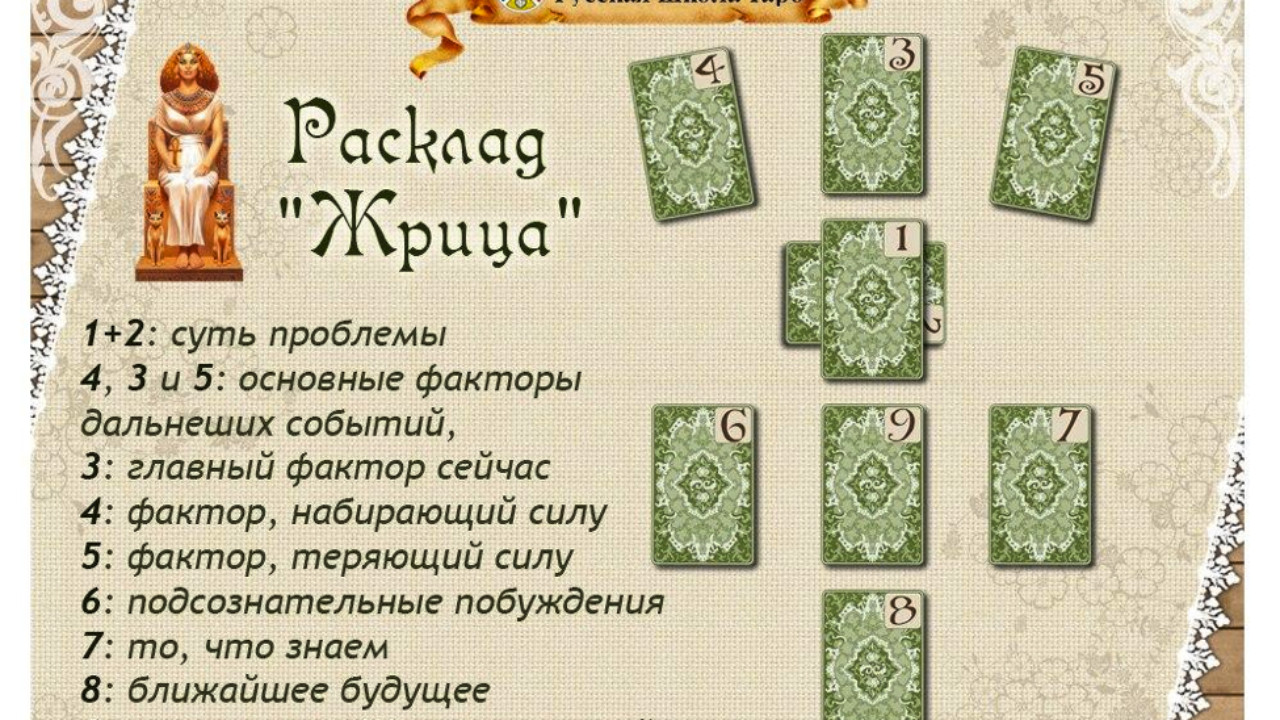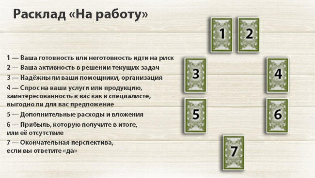 карты, символизирующие события прошлого, текущую ситуацию и вероятное будущее. 4. Расклад на ситуацию — используется семь карт: