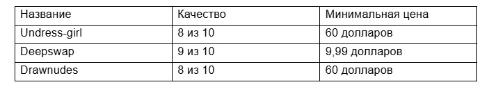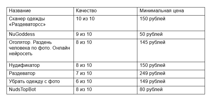 Ниже также таблица для наглядного сравнения сервисов: Практически ни один качественный бот для раздевaния бесплатно работать не будет. Пользователю может быть представлена возможность провести обработку одной или двух фотографий, чтобы оценить особенности работы и качество, детализацию и цветопередачу. Но полностью на бесплатной основе ни боты, ни сервисы, предлагающие детальную проработку тела, не работают. 2. Можно ли пользоваться ботами до достижения совершеннолетия? В пользовательском соглашении всегда прописывается, что при продолжении использования программы пользователь подтверждает факт достижения совершеннолетия. По сути, эта информация никак не проверяется, что делает ботов в социальной сети общедоступными.