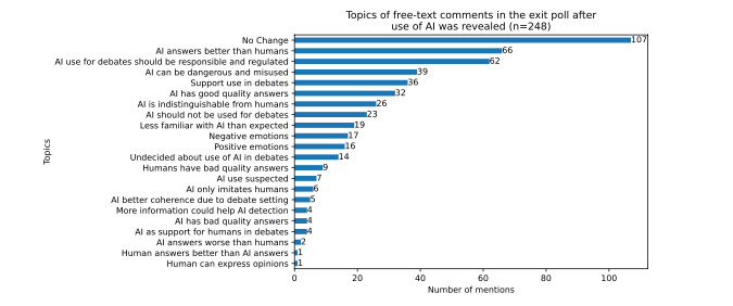 Важно отметить, что существуют ограничения на сравнение ответов, сгенерированных искусственным интеллектом, с реакциями человека вживую. Например, политики испытывают нехватку времени и не могут вкладывать в свои ответы те же ресурсы, что и система искусственного интеллекта. Исследователи предупреждают: «Субъекты угрозы могут легко использовать LLM для загрязнения сферы общественной информации фальшивыми, но достоверными политическими заявлениями, например, для того, чтобы посеять путаницу в отношении того, какими на самом деле были замечания, и выдумать темы для обсуждения ». Более 85% участников исследования сочли, что использование искусственного интеллекта в публичных дебатах должно быть прозрачным, а информацией о развитии искусственного интеллекта следует делиться. Исследователи подчеркивают необходимость информирования общественности о современных возможностях ИИ. Многие участники изначально недооценивали потенциал технологии. Узнав об использовании ИИ, они продемонстрировали большую признательность за возможности ИИ, но также возросло стремление к регулированию. Исследование подтверждает предупреждение генерального директора OpenAI Сэма Альтмана, который сказал, что ИИ в конечном итоге достигнет сверхчеловеческой силы убеждения, и это «может привести к некоторым очень странным результатам». Есть еще одно исследование, проведенное EPFL и итальянским фондом Бруно Кесслера, которое показало, что GPT-4, благодаря доступу к личной информации, смог увеличить согласие участников с аргументами их оппонентов на замечательные 81,7 процента по сравнению с дебатами между людьми. Краткие сведения