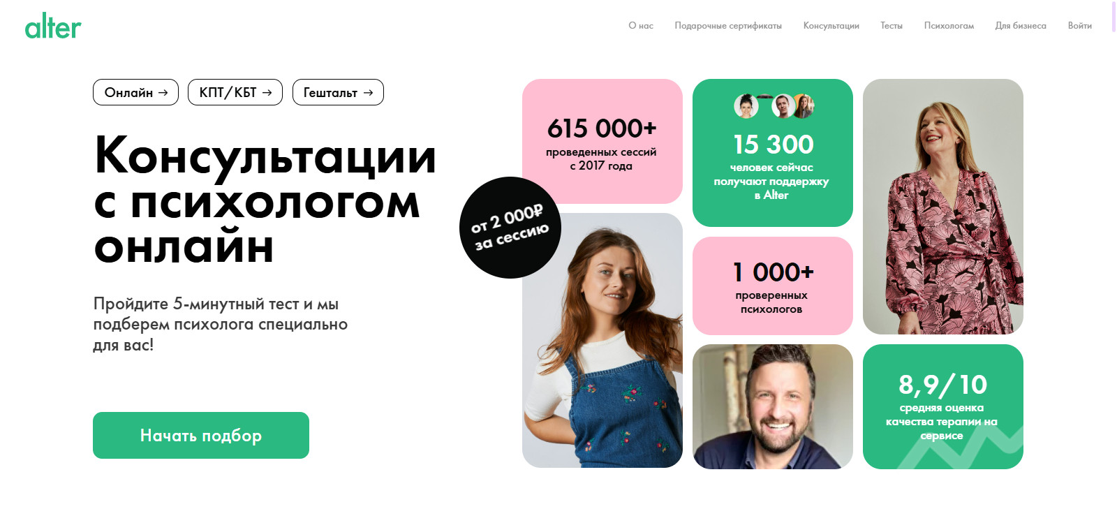- Alter — нишевый проект, сфокусированный на когнитивно-поведенческой терапии; формат работы — исключительно видеосессии.