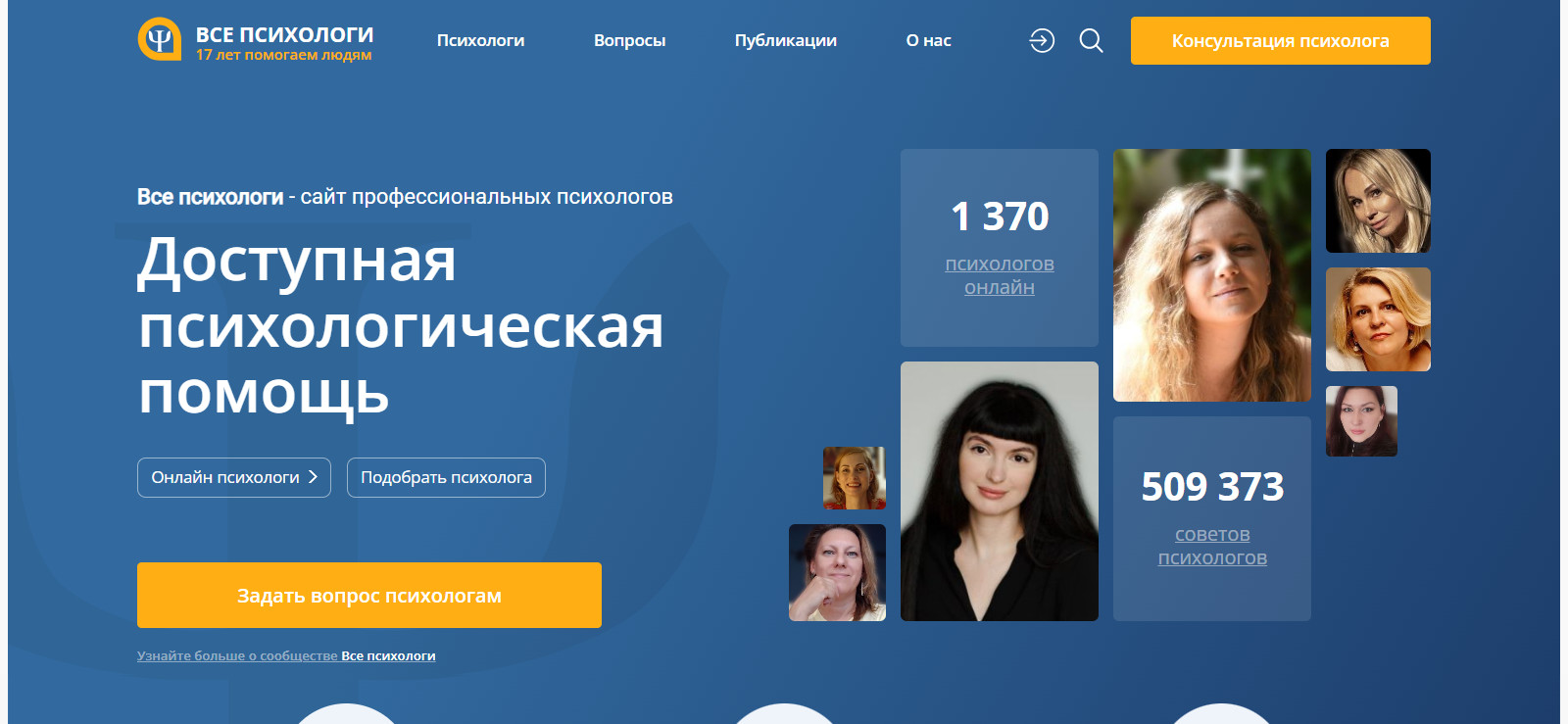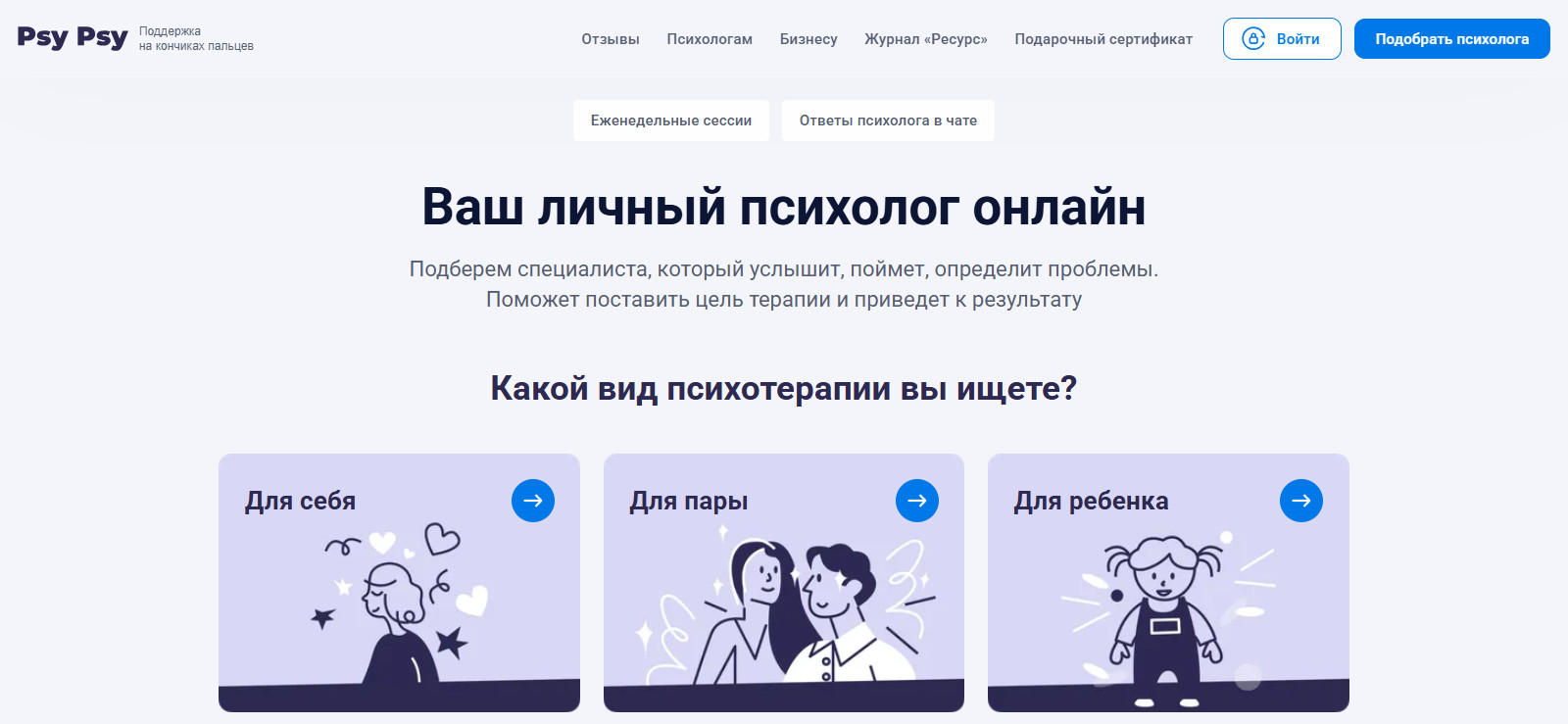 - ПсиЧат — сервис, где легко подобрать сертифицированного психолога и общаться с ним через чат или видеосвязь в удобное время.