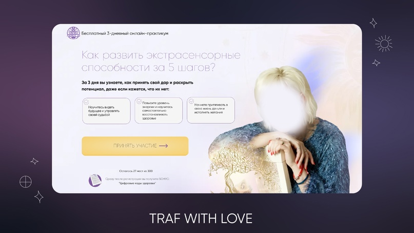 Хоть и эффективность воронки — не наша зона ответственности, мы всегда погружаемся в детали проекта для получения максимального результата от настройки рекламы. Это позволяет годами сотрудничать и добиваться поставленных задач. Именно об этом сегодня наш кейс. С онлайн-школой по экстрасенсорным способностям мы работаем уже больше года. Они обратились к нам за тестированием нового источника трафика и не ошиблись. Изначально клиент поставил цель по привлечению заявок стоимостью до 350 рублей. И с самого первого месяца мы превзошли ожидания и стабильно удерживаем стоимость ниже желаемой. Средняя стоимость лида за всё время работы на данный момент составляет 260 рублей за регистрацию на онлайн-практикум. Ниже расскажем, за счёт каких аспектов нам удается показывать такие результаты. Если вы подумали, что это всё благодаря колдовству и магии, то правильно сделали. Наша команда колдует каждый день, чтобы даже в турбулентные месяца праздников и мировых событий стоимость регистрации держалась на одном уровне. Первым этапом мы принялись за анализ посадочной страницы. Трафик нужно было вести на сайт с бесплатным 3-х дневным онлайн-практикумом. С его помощью человек узнает, как принять свой дар и раскрыть потенциал, даже если кажется, что его нет. Программа онлайн-практикума достаточно насыщенная и закрывала многие боли целевой аудитории: День 1: Диагностика энергополя на порчи и негатив за 15 минут.День 2: Как исцелять организм без таблеток в любом возрасте.День 3: Как видеть будущее, управлять судьбой и притягивать финансы. Скажите же, что уже хотите написать нам и попросить ссылку на этот онлайн-практикум? Целевой аудитории тем более сложно пройти мимо таких триггерных тем. В дальнейшем это помогло использовать большое количество ключевых слов, но об этом чуть позже. Это люди, которые заметили у себя экстрасенсорные способности и хотят в этом убедиться. Либо пытаются понять есть ли предрасположенность к экстрасенсорным способностям и ясновидению. А кто-то просто хочет поправить здоровье своим близким. В процессе работы над проектом мы уделили внимание возрасту в рекламных кампаниях. Изначально стартовали с возраста 25+, но после изучения доходимости до онлайн-практикума скорректировали его до 35+. Также мы не ограничивали верхнюю границу, потому что спикер с 25-летним практическим опытом. Целевая аудитория идет более возрастная, при создании рекламных кампаний есть отдельный сегмент с возрастом 55-60 лет. Мы работали напрямую с ключевыми словами, заходили с разных сегментов. При просмотре сайта может сложиться впечатление, что целевой аудитории интересна только экстрасенсорика и биоэнергетика. Но это самая верхушка айсберга. Если изучить тему экстрасенсорных способностей более детально, то появляются новые неочевидные сегменты. Это и ясновидение, и очень большой сегмент тех, кто ищет информацию о том, как снять негативное воздействие. Многие переживают о порчи на роду или уже убедились в её наличии и хотят узнать, как можно снять порчу. Точно такой же сегмент со сглазом. Онлайн-практикум полезен людям, которые интересуются целительством или непосредственно ищут целителей. Не будем забывать о магии, в 2024 году она пользуется особой популярностью. Чего только стоит шоу «Битва экстрасенсов», которое бьет все рейтинги. Также работали 