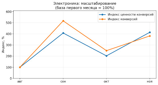 На графиках — реальные результаты из двух принципиально разных категорий: электроника (длинный цикл принятия решения, высокая цена ошибки) и гигиеническая продукция (импульсный спрос, высокая частота покупок). Мы сознательно показываем оба кейса, чтобы продемонстрировать: наши подходы к управлению трафиком работают независимо от поведения аудитории.