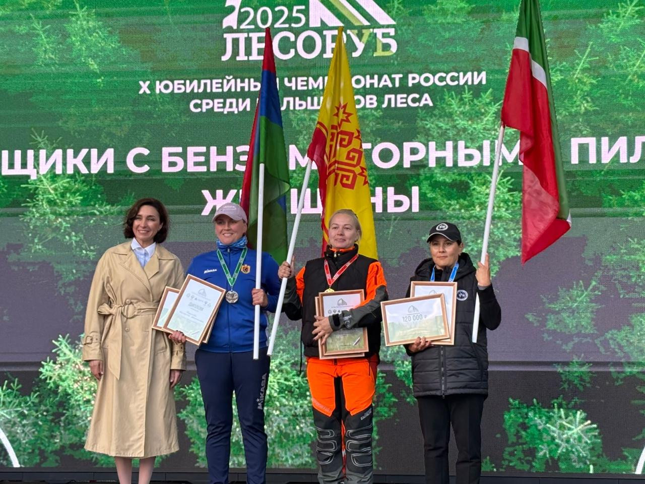 Елена Шумейко, менеджер по корпоративным коммуникациям НПАО «Светогорский ЦБК», наградила от компании участниц чемпионата, занявших призовые места в индивидуальном зачете среди женщин. «От лица Светогорского ЦБК рада поздравить победителей 10-го, юбилейного чемпионата России „Лесоруб-2025“. Вальщик леса — это почетная профессия, в которой прекрасно себя проявляют как мужчины, так и женщины. Она требует большого мастерства, внимания к деталям, соблюдения техники безопасности, умения работать с современной техникой. Лес — это наше общее достояние, поэтому особенно важно проводить работы, соблюдая все принципы устойчивого лесопользования. Например, в Тихвинском КЛПХ, который входит в состав нашей компании, мы ежегодно высаживаем три сеянца взамен каждого заготовленного дерева, а также тщательно ухаживаем за молодняком на протяжении всего цикла его роста», — отметила Елена Шумейко.