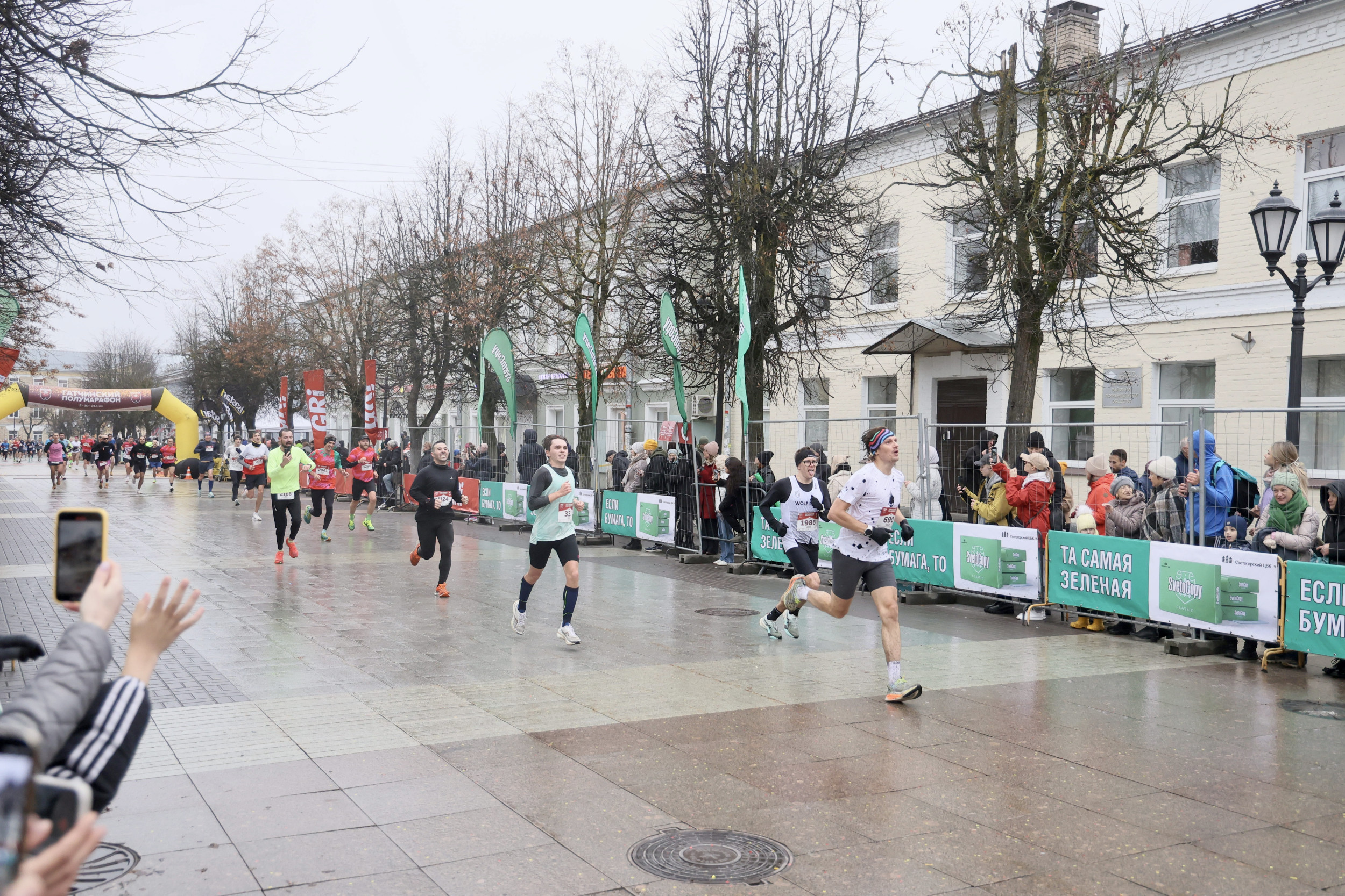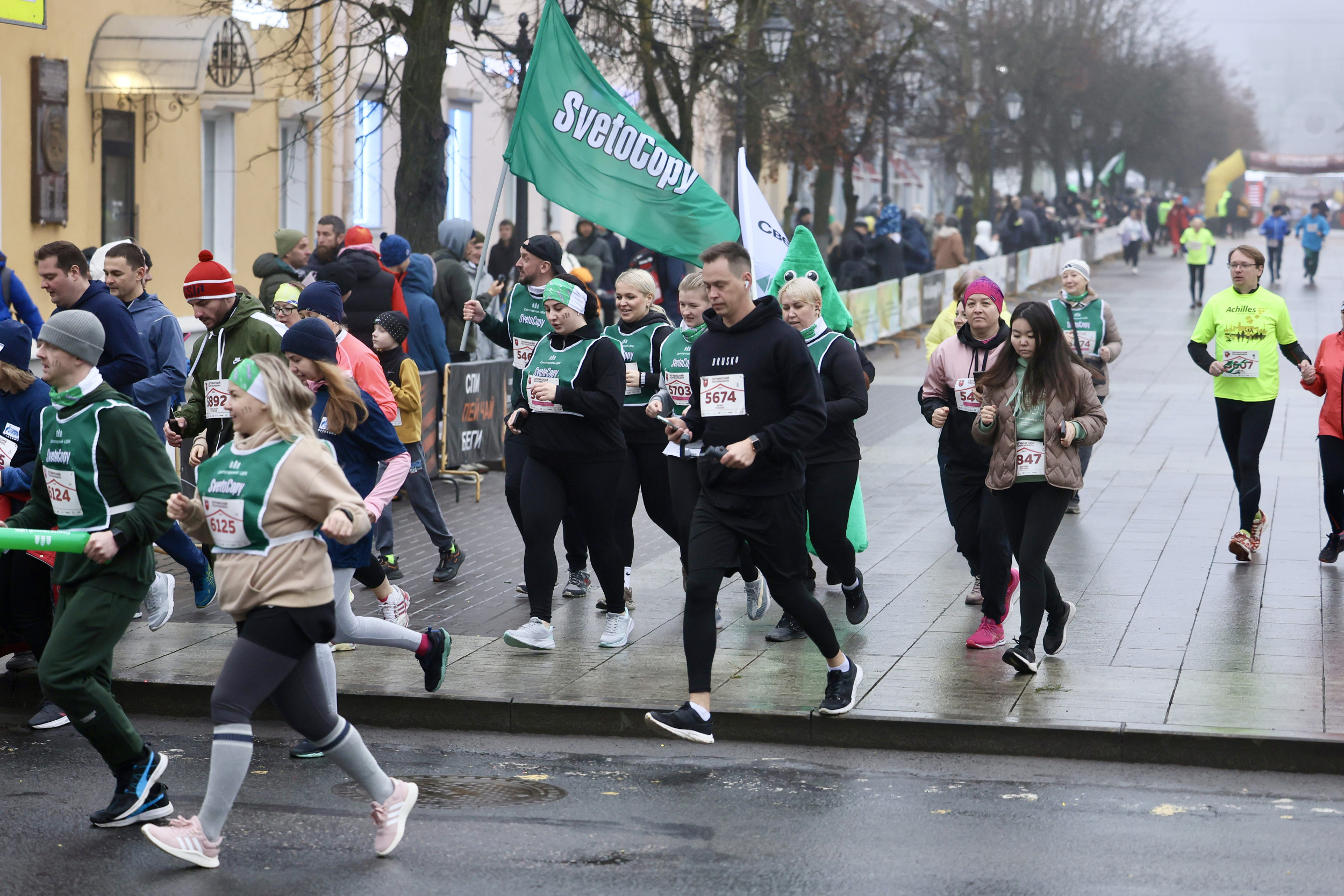Трасса Гатчинского полумарафона проходила по центру города вдоль красивых исторических зданий, ее украсили яркими зелеными флагами и баннерами SvetoCopy. Для того чтобы подбадривающие слова болельщиков звучали громче и энергичнее, Светогорский ЦБК приготовил для зрителей картонные трещотки и надувные палки-стучалки фирменного зеленого цвета. Ростовые куклы в виде пачки SvetoCopy и елочки Светогорского ЦБК воодушевляли бегунов во время всего дня соревнований.
