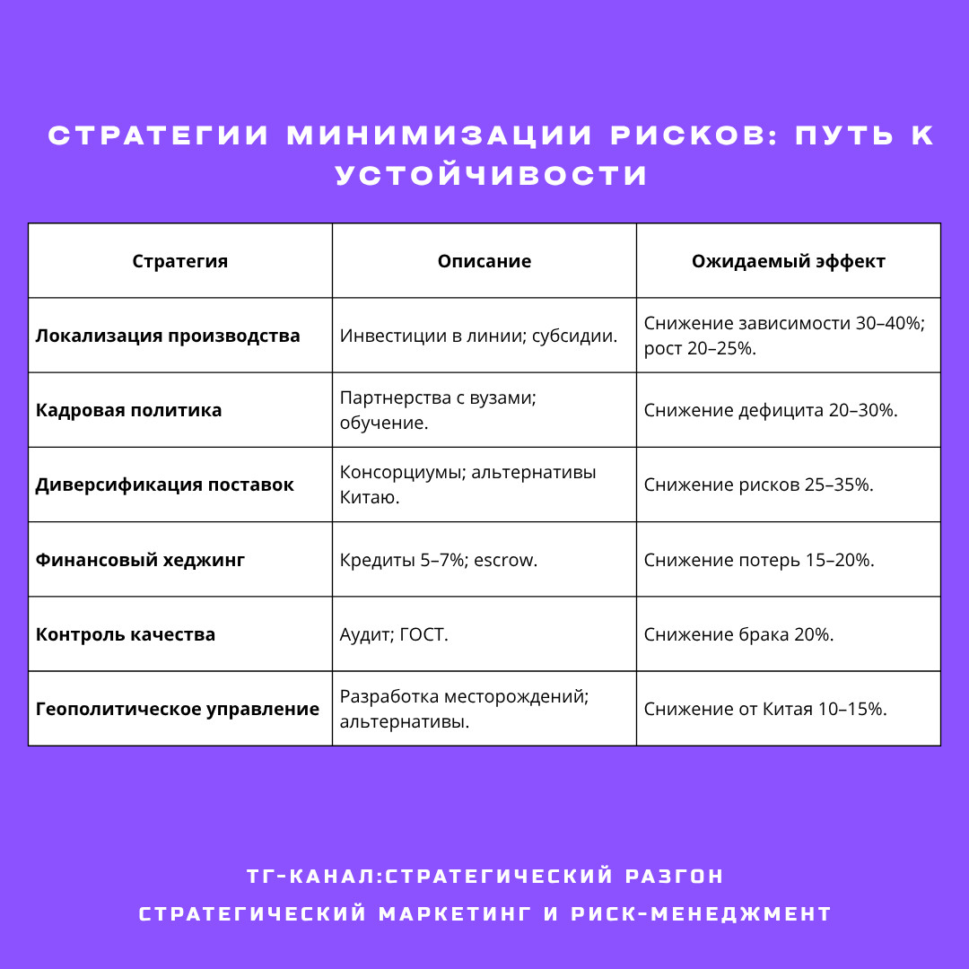 Особое значение приобретает рынок химических материалов для микроэлектроники, объём которого превышает 35 млрд рублей и продолжает расти за счёт государственной программы локализации критических компонентов (фоторезисты, газы высокой чистоты, травильные составы). Зависимость от импорта в этой нише достигает 70–80%, что делает её уязвимой точкой в цепочке технологического суверенитета. Теперь я создала Roadmap для компании на 18–24 месяца: снижение потерь до 10%, рост доли рынка до 20–25% за счёт системной локализации, диверсификации и цифровой трансформации. Кейс «Байкал Электроникс» — это не просто история выживания, а модель перехода от реактивного импортозамещения к проактивному технологическому лидерству. При правильной реализации стратегий отрасль способна не только минимизировать риски, но и выйти на экспортные рынки СНГ и Азии. Ежеквартальный мониторинг рисков по ISO 31000 становится обязательным элементом корпоративного управления. Успех определяется тонким балансом между глубокой локализацией и сохранением глобальных технологических партнёрств, где Россия выступает не потребителем, а соразработчиком решений. ➡🔥Больше о стратегическом маркетинге и риск-менеджменте здесь. Также я разработала для бизнеса бесплатные шаблоны. Подпишись!