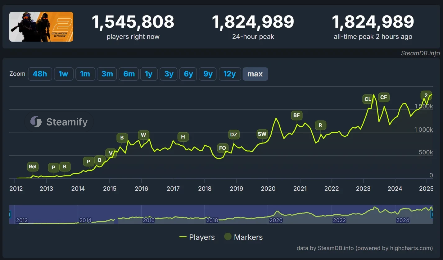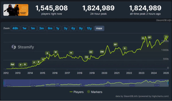 Интересно, сколько людей играют в КС 2 в пиковые моменты? Теперь мы знаем точный ответ — почти 1,83 миллиона!