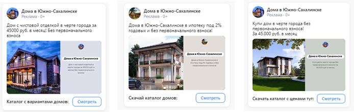 Использовали статические изображения готовых домов, планировки разных моделей. Вели основную часть креативов на готовые дома, т.к. для заказчика продажа готовых домов была приоритетней.