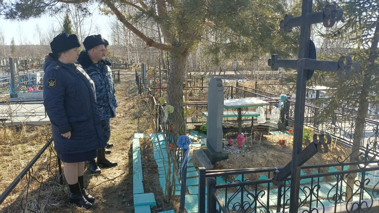 Сотрудниками Медведевского районного отделения, не забывающими своего ветерана, проведена уборка могилы покойного, убрали старую листву, подпилили дерево, так как после зимы оказалась сломана большая ветка сосны, возложили цветы и почтили память коллеги минутой молчания.