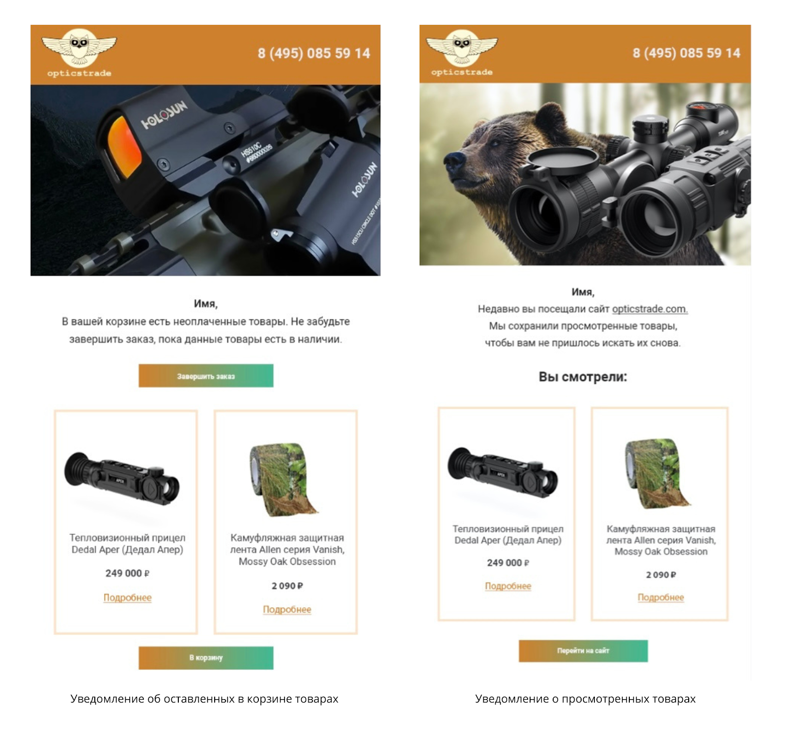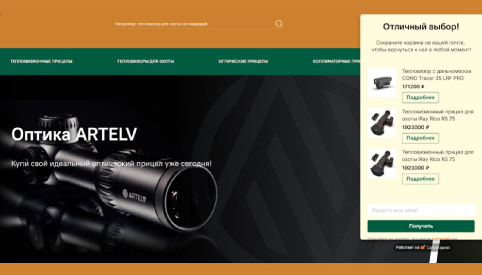 Для реализации идеи я обратился к партнерам из компании Completo. Моя цель заключалась не только в повышении конверсии, но и в улучшении взаимодействия с клиентами на всех этапах воронки продаж. Мы подключили на сайте OpticsTrade Google Analytics и «Яндекс.Метрику» для анализа поведения посетителей: от момента захода на сайт до тех случаев, когда они оставляют товары в корзине, не совершая покупки. Вот что нам удалось выяснить: Мы начали с определения основных триггеров и сценариев для отправки сообщений. Специфика рынка оптических приборов оказали влияние на стратегию. «Наши клиенты — опытные охотники, которые внимательно подходят к выбору своего оборудования. Покупка оптики аналогична покупке квартиры, происходит она всего 1-2 раза за жизнь, но я всегда подчеркиваю, что наши менеджеры должны рассматривать партнерство как долгосрочное. Анализ повторных продаж и множество рекомендаций подтверждают, что такой подход оправдан», — говорит Александр Семаков, генеральный директор OpticsTrade. С учетом длительного цикла продаж мы пересмотрели нашу цепочку уведомлений. Как выглядит структура цепочка сообщений: В этих сообщениях есть информация о самой продукции, ее характеристиках, отзывах, а также рекомендации сопутствующих товаров, что способствует увеличению интереса со стороны клиентов. Мы добавили кнопки «Завершить заказ» или «Вернуться в корзину», что делает процесс продолжения покупки удобным. Для улучшения результатов мы регулярно проводили тестирование уведомлений, использовав A/B-тестирование. Мы проверяли различные заголовки, временные интервалы отправки и экспериментировали с дизайном писем, чтобы определить наиболее эффективный формат. В рамках одного из экспериментов мы изменили оформление всплывающих окон для сбора адресов. Вместо малопривлекательного предложения подобрать аналог, мы добавили изображение довольного мясника и девушки с тепловизорами. Результаты оказались предсказуемыми. При этом мы постоянно анализировали статистику по открытию писем, кликам и конверсиям, внося необходимые изменения в нашу маркетинговую стратегию. Чтобы улучшить процесс сбора контактной информации, мы внедрили несколько решений: Квизы. Они помогают подобрать подходящую оптику, предлагая ответить на вопросы о типе охоты и используемом оружии. Взамен мы просим оставить электронную почту для получения персонализированных рекомендаций. Конверсия в подписчики выросла до 15%. Подписка на блог. Мы создали возможность выбора интересов: новости, видеообзоры и советы по использованию оптики. Сохранение корзины. Если посетитель уходит со страницы, не завершив покупку, мы предлагаем ему сохранить товары в корзине, предоставляя возможность оставить e-mail для уведомлений. Мы заметили, что персонализированный подход не только увеличил наши продажи, но и повысил лояльность клиентов. Теперь покупатели воспринимают наши сообщения как ценные рекомендации, а не как навязчивую рекламу. За четыре месяца, с мая по июль 2024 года, получили такие результаты: Рассылки не только уменьшили число брошенных заказов, но и вошли в число ключевых элементов нашей стратегии email-маркетинга. Кроме того, триггерные рассылки повлияли на улучшение клиентского опыта. Теперь мы можем быстро предложить покупателям именно то, что они ищут. Например, после того, как клиент посм