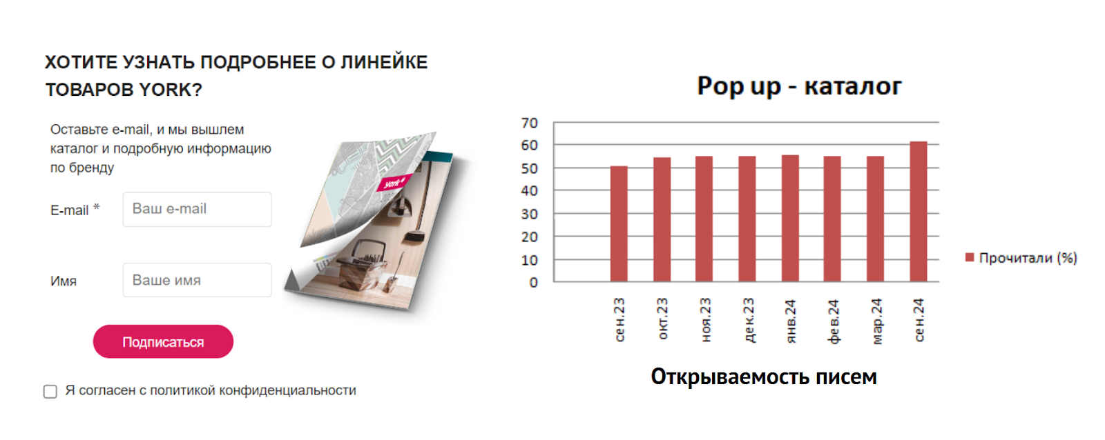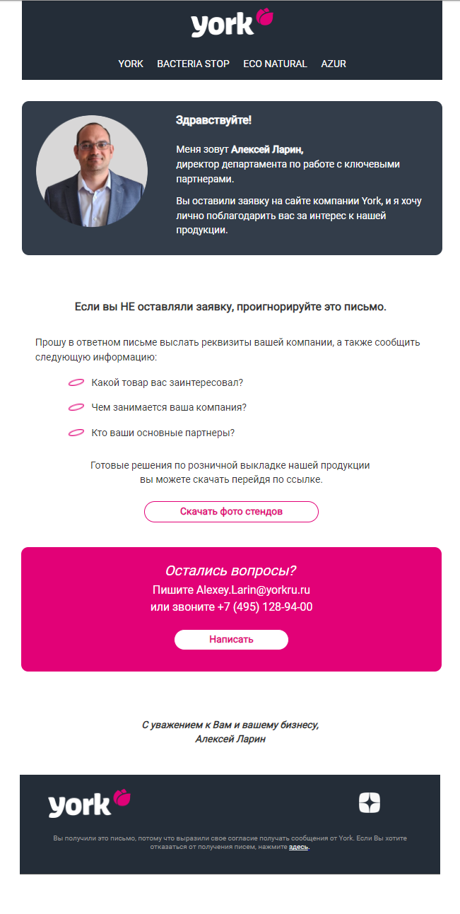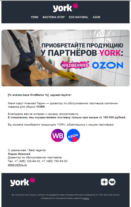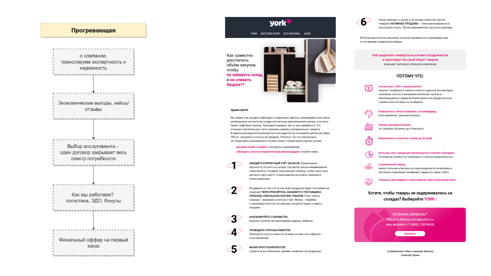 В 2023 году розничная интернет-торговля в России достигла объема ₽7,8 трлн и 5 млрд заказов. Темпы роста числа заказов составили 78 %, а объем рынка в рублях увеличился на 44%. По прогнозу консалтингового агентства Statista, к 2025 году выручка от продаж в электронной коммерции B2B в России достигнет почти 47 млрд долларов США. Таким образом, рынок B2B онлайн-торговли в России вырастет вдвое. По данным Data Insight, к 2025 году 75 % B2B-сделок в России будут осуществляться через цифровые каналы. Есть заметное изменение в поведении B2B-покупателей, что связано с влиянием B2C-опыта. Клиенты в B2B ожидают такого же удобного и персонализированного подхода, как в розничной торговле. Они хотят получать информацию быстро и в удобное время. Эти изменения также влияют на процесс принятия решений: клиенты активно изучают отзывы и всю доступную информацию перед тем, как что-то купить. Если посмотрим на западные страны, то увидим, что только 14 % компаний в B2B-сегменте действительно хорошо ориентированы на клиента. Еще 31 % считают, что их уровень клиентоориентированности оставляет желать лучшего. Эти выводы были получены в результате опроса более 500 компаний, проведенного агентством B2B International. Также B2B-компании сталкиваются с новыми вызовами и нуждаются в новых стратегиях. Очень важно уметь настраивать автоматизацию продаж и CRM-системы, хотя многие не готовы инвестировать в эти технологии из-за ограниченных ресурсов. York — производитель товаров для уборки. Продажи для B2B-сектора осуществляются через дилеров и торговые сети. Клиенты выбирают York, потому что это мировой бренд, который своим широким ассортиментом закрывает весь спектр потребностей в средствах для уборки. Разные ценовые категории увеличивают наш охват, а комплексная поддержка и доставка по России подтверждают клиентоориентированность. Мы продаем через многие каналы, но рассылками по электронной почте не занимались. У нас была база адресов, которая не работала. Она пополнялась несколько лет, но никогда не валидировалась. Необходимо было проверить ее качество. Я знал о механиках email-маркетинга, но никогда не занимался рассылками или другой коммуникацией по базе. Основной вариант взаимодействия с клиентами, принятый в York, — общение по конкретным заказам. Чтобы дать продажам дополнительный толчок, я обратился к коллегам из компании Completo, которые разработали для нас email-стратегию, запустили грамотную работу с базой клиентов, что привело к увеличению количества контактов и росту продаж. Важно добавить, что email-маркетинг — это дополнительный инструмент лидогенерации, который гармонично дополняет контекстную рекламу и сео-оптимизацию сайта. Часть SEO-трафика сразу конвертируется в клиентов, часть — уходит в email-базу и дальнейшую работу. Email-маркетинг может давать результат не сразу, а постепенно. Внедрение email-маркетинга происходило поэтапно. Отправной точкой стал комплексный анализ трех ключевых аспектов: внутренних процессов компании, конкурентной среды и детального портрета целевой аудитории. Основные моменты, на которые мы обратили внимание: Мы выяснили, что конкуренты более системно работают с рассылками, коммуницируют с пользователями и привлекают новую аудиторию с помощью всплывающих окон и форм захвата. Также мы пришли к выводу, что с пользователями необходимо начать работать на этапе формирования пот