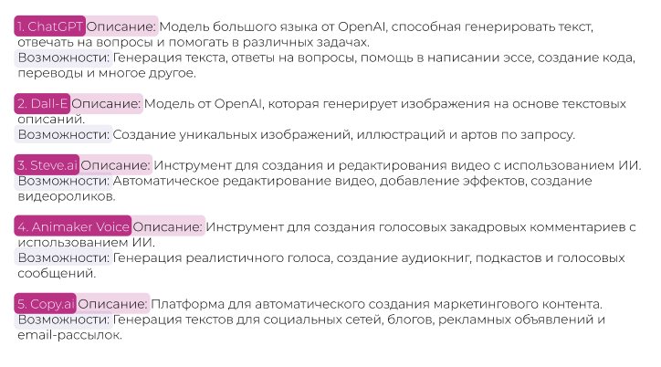 Инструменты вроде Midjourney и DALL·E позволяют создавать уникальные обложки, иллюстрации, дизайны и даже фоны для видео.