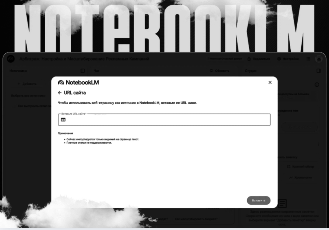 В отличие от некоторых других западных AI (привет VEO3), NotebookLM AI работает в России без VPN и прочих заморочек. Не нужно городить прокси, искать обходы или переживать, что сервис внезапно станет недоступен. Просто заходишь, загружаешь свои файлы или ссылки — и начинаешь работать. Это делает инструмент не только удобным, но и стабильным выбором для тех, кто не хочет отвлекаться на технические сложности и предпочитает тратить время на реальные задачи: анализ связок, создание крео и оптимизацию кампаний.