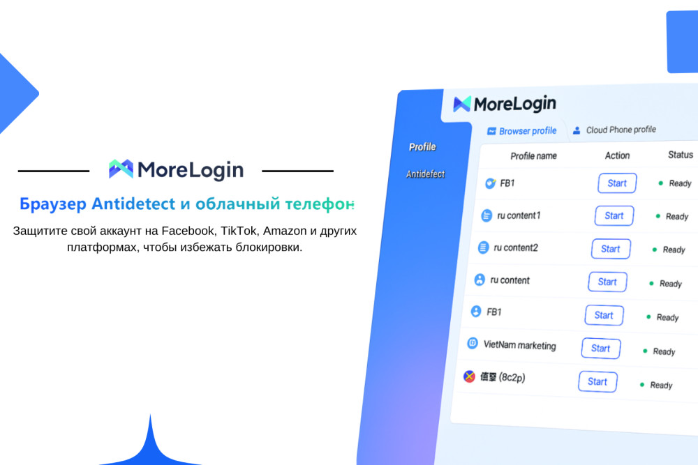 Уникальные Возможности: CloudPhone Использование облачного телефона Morelogin имеет следующие преимущества: Облачные телефоны подходят для автоматической работы аккаунтов TikTok/электронной коммерции и задач пакетной обработки. Разработчики могут развернуть несколько сред версий системы для тестирования приложений. Запрет можно обойти, имитируя сбор данных с нескольких мобильных телефонов. Он используется для моделирования сетевой среды и поведения мобильных телефонов в разных регионах, чтобы помочь пользователям управлять учетными записями и добиваться точной доставки в ходе рекламного процесса. . Это поможет вам вести свой бизнес просто и с низкими затратами. В 2024 году несколько популярных антидетект браузеров столкнулись с серьезными проблемами. В этом контексте MoreLogin демонстрирует стабильность. Браузер прошел аудит безопасности от SlowMist — компании, которая проверяла такие проекты, как Binance и Tether. Также разработчики сотрудничают с ScamSniffer, что обеспечивает дополнительную защиту от фишинга Тарифная Политика MoreLogin предлагает гибкие условия использования. Бесплатный тариф включает 2 профиля, что позволяет протестировать основные функции. Платные подписки дают доступ к неограниченному количеству профилей, функции CloudPhone и приоритетной технической поддержке. Оплата возможна через криптовалюты, банковские карты и PayPal, что делает сервис доступным для пользователей из разных стран. MoreLogin — это не просто инструмент для обхода блокировок, а комплексное решение для безопасной работы в интернете. Его главные преимущества: Если вам важно сохранить анонимность и избежать блокировок, MoreLogin — один из лучших выборов на рынке. Начните с бесплатной версии по нашему промокоду: https://www.morelogin.com/register/?from=sparkru и убедитесь в его надежности!