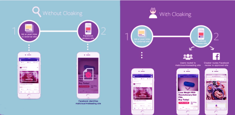 Основная цель клоакинга — скрыть запрещённый контент от модераторов и алгоритмов рекламных платформ (Facebook, Google, TikTok и др.). Без клоакинга подобные офферы не пройдут модерацию, а аккаунт рекламодателя получит бан. С клоакингом модератору показывается разрешённая страница (white page), а целевой пользователь попадает на продающий лендинг (black page).