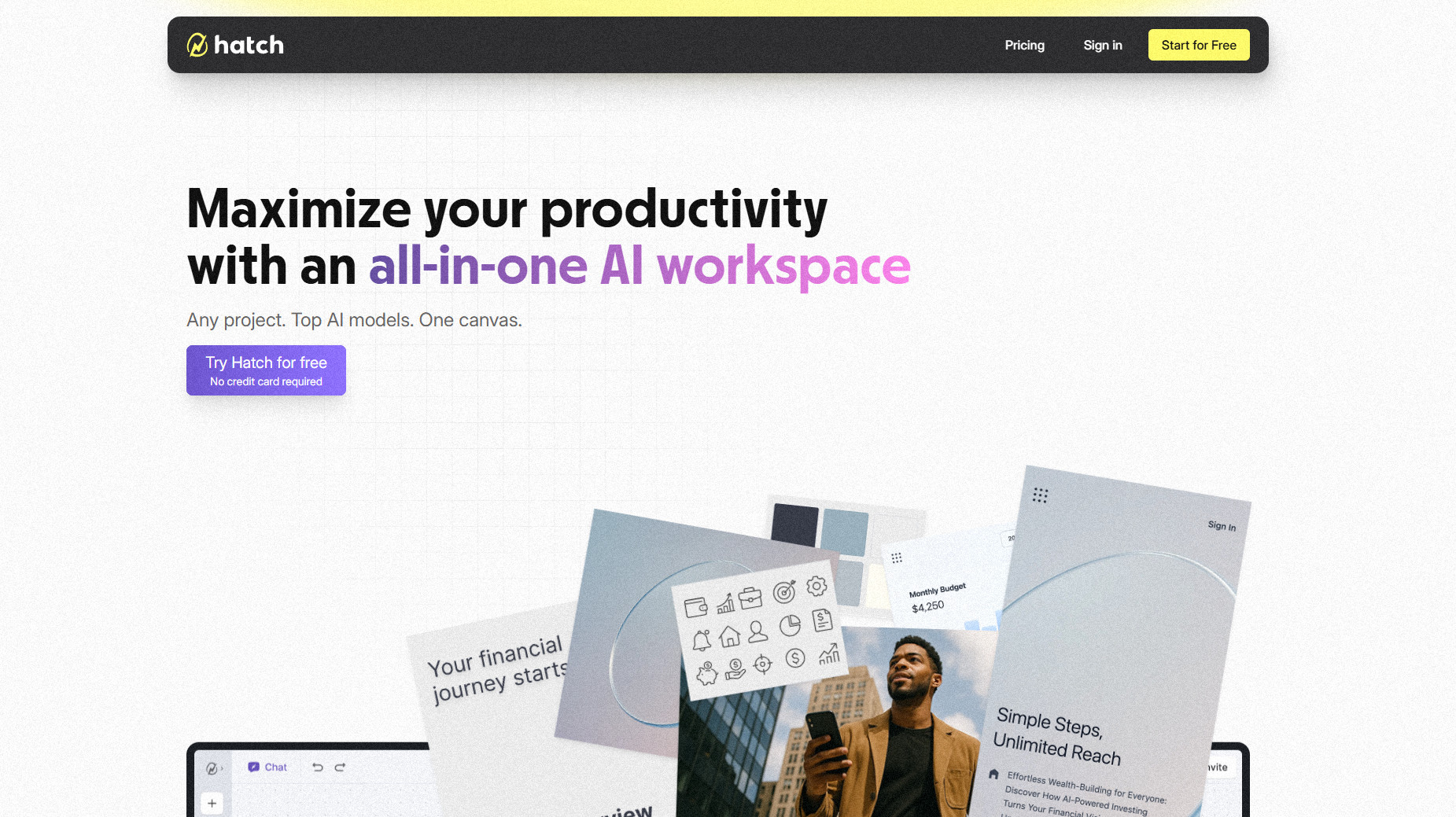 Главная страница демонстрирует концепцию Hatch: работа ведётся не только через текстовые запросы (промпты), но и на основе уже размещённых на холсте материалов. Алгоритм сначала анализирует всё содержимое рабочей области (наброски, изображения, идеи), затем учитывает промпт, и только после этого собирает сайт. Каждый сгенерированный элемент автоматически оформляется в виде кода, который пользователь может доработать.