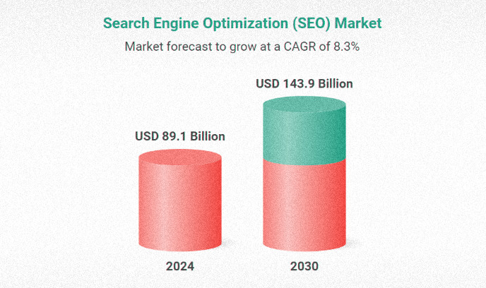 Сейчас все говорят что СЕО уже не актуально, но фактические показатели демонстрируют хорошую динамику. Мировой рынок SEO как не крути растёт: объём в $82,3 млрд в 2023 году, увеличится до $143,9 млрд к 2030-му при среднегодовом росте 8,3%. Даже скажем так, большинство маркетологов оценивают SEO как более эффективный инструмент продаж, чем контекстная реклама.