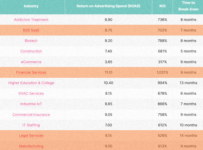 Немного статистики: финансовый сектор достигает ROI на уровне 1031% с возвратом инвестиций примерно за девять месяцев; производственные компании получают 813% при тех же сроках окупаемости; B2B SaaS демонстрирует 702% с возвратом через семь месяцев; юридические услуги показывают ROI 526% при конверсии 7,5%.