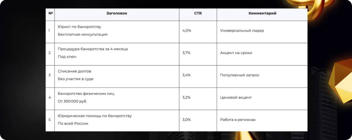 Кейс по банкротству в Яндекс Директ - 1914 лида по 929 ₽ и 138 договоров по 12 889 ₽