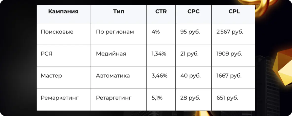- 16 поисковых кампаний12 РСЯ (текстово-графические)4 Мастер кампаний