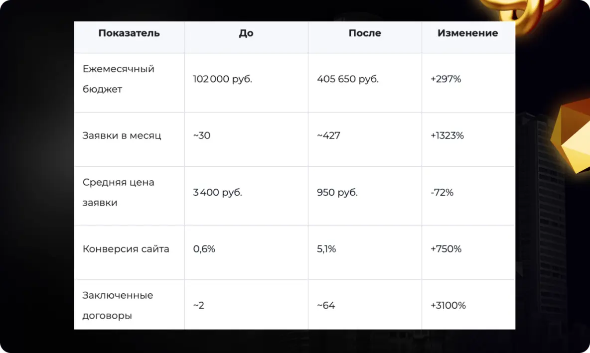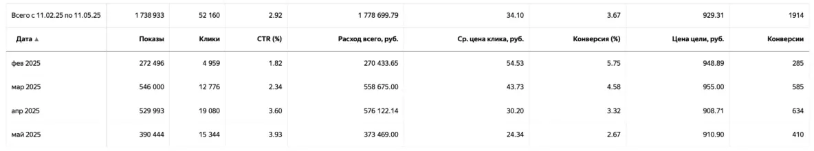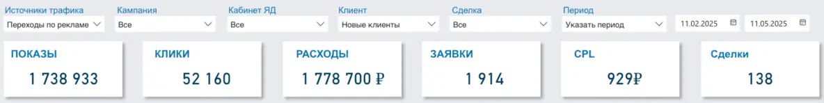 Несмотря на высокую стоимость привлечения клиентов (стоимость лида более 3 400 рублей) и крайне низкое количество заявок, подрядчики продолжали какую-то «оптимизацию» без какой-либо отчетности. В результате клиент потерял несколько месяцев и значительную сумму бюджета, так и не получив результат.