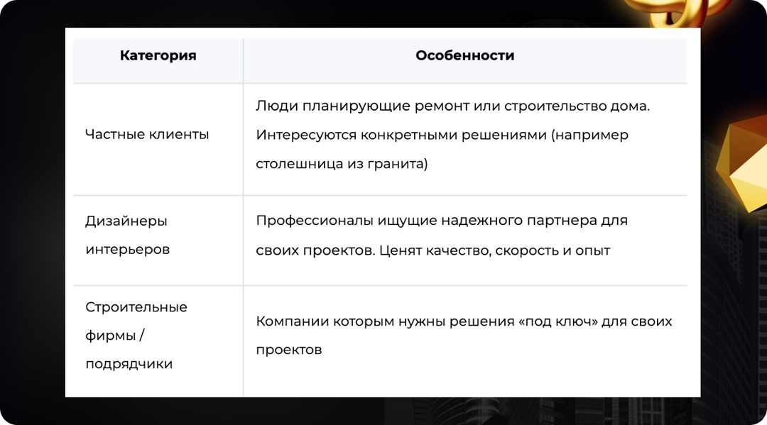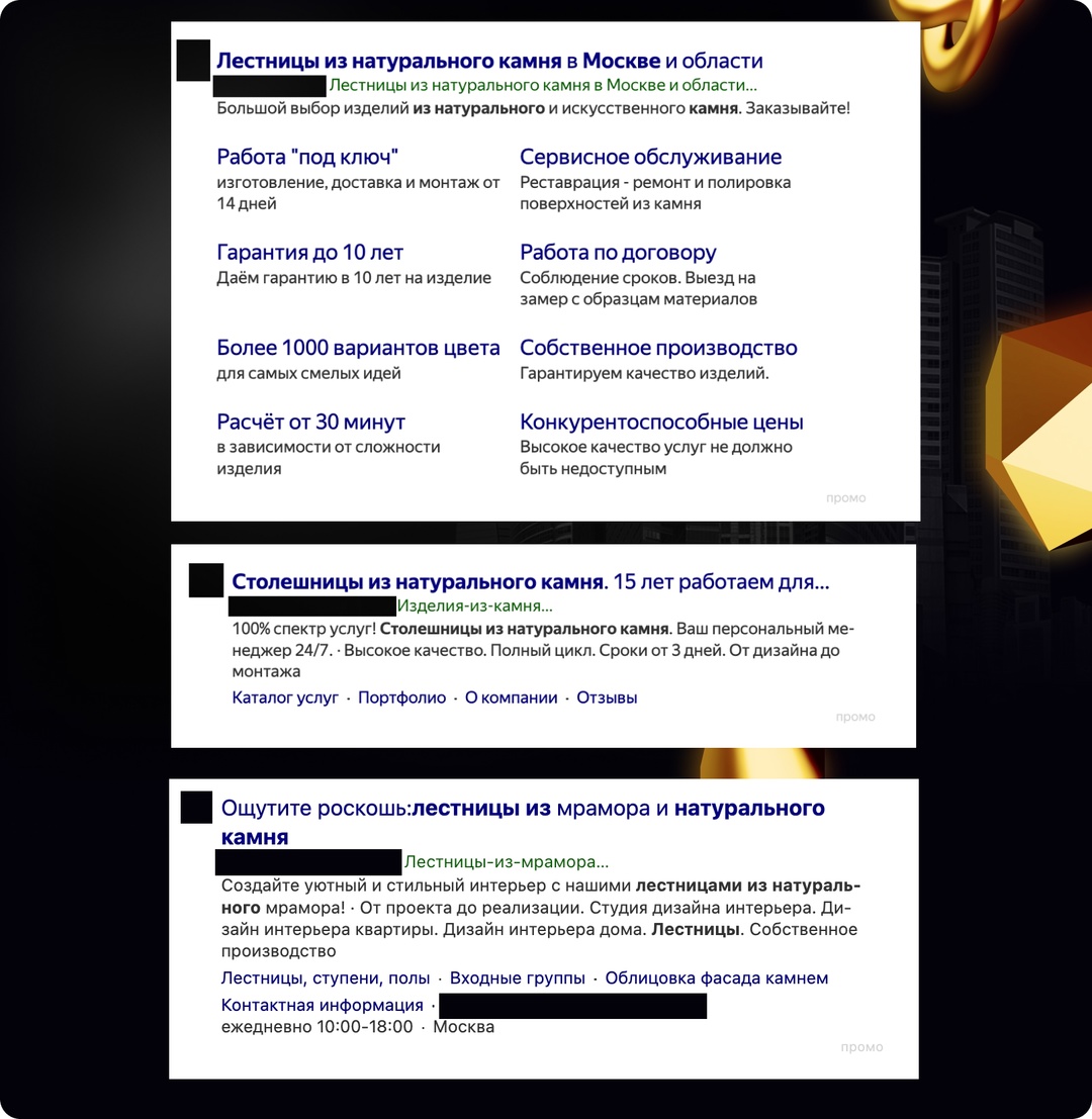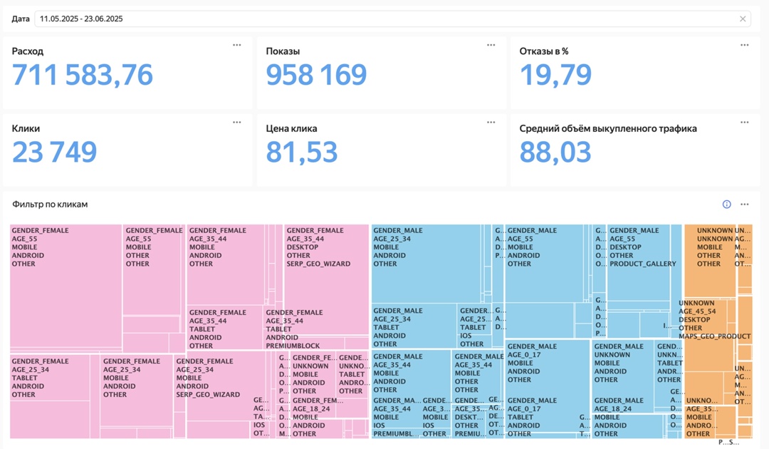 Целевая аудитория была разбита на три ключевых кластера : Для каждой группы были подготовлены отдельные рекламные кампании , уникальные объявления, персонализированные посадочные страницы и креативы. В основе рекламных кампаний лежало расширенное семантическое ядро: Мы также составили список из 670+ минус-слов , чтобы исключить нерелевантный трафик (например: «купить дешево», «самостоятельно», «фото», «бесплатно» и многое другое). Для рекламы в Рекламной сети Яндекса (РСЯ) мы разработали баннеры на основе реальных фото изделий и производства. Также были созданы визуализации готовых решений в интерьере. Пример креативов без текстов: Благодаря качественным визуальным решениям и точному таргетингу удалось получить высокий CTR и хорошую конверсию. Для повышения прозрачности и оперативного принятия решений по управлению кампаниями была настроена аналитическая панель в DataLens. Эта система позволяет клиенту в режиме реального времени следить за показателями и принимать обоснованные решения по увеличению рекламного бюджета и масштабированию рекламных кампаний.. Для повышения конверсии внедрили ретаргетинговые кампании : Для защиты рекламного бюджета использовались следующие меры: Общий рекламный бюджет: 711 584₽ Средняя цена заявки: 1 381,71₽ Успешных сделок с расчетом КП: 197 (38,25%) Прогнозируемый оборот: 27 580 000 ₽ Digital-маркетолог с опытом более 10 лет. Подписывайся на мой телеграм-канал: Просто про маркетинг