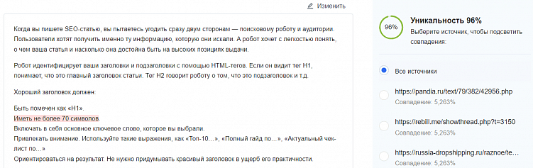 В процессе рерайта полезно будет отслеживать процент уникальности текста. Закончив с одним фрагментом, сделайте его проверку с помощью инструмента «Антиплагиат онлайн». Если оригинальность остается недостаточно высокой, перепишите те части текста, которые сервис посчитал заимствованиями.