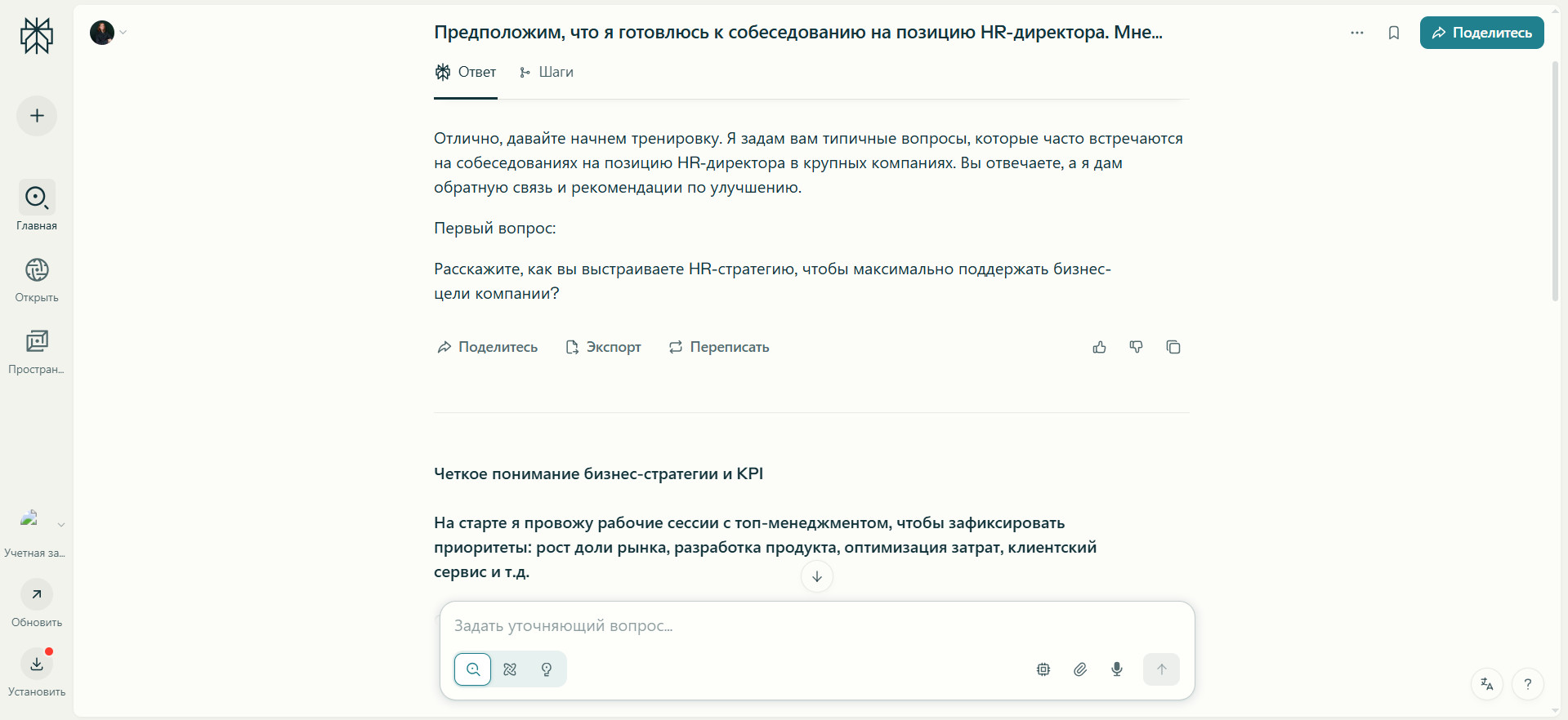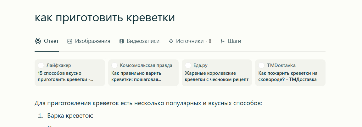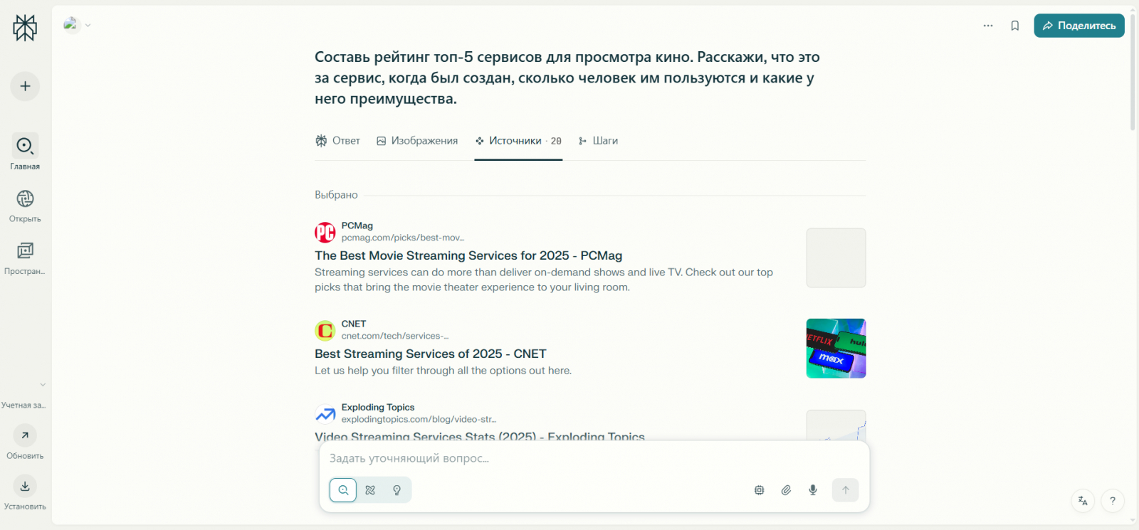 Perplexity AI понимает вопросы на русском, причем как краткие, так и развернутые. Например, можно спросить: «Что такое искусственный интеллект?» или дать более детальный запрос: «Объясни принцип работы искусственного интеллекта простыми словами для новичка». Чем точнее сформулирован запрос, тем лучше будет ответ. Советуем указывать контекст — для кого предназначена информация (студент, профессионал) и в каком формате ее представить (список, таблица, краткое объяснение). После отправки запроса Перплексити может задать уточняющие вопросы, чтобы лучше понять, что именно нужно пользователю. Например, если спросить «Что такое Python?», сервис может предложить сравнить его с другим языком программирования или рассказать о его применении в конкретной сфере. Эти уточнения помогают углубиться в тему: достаточно кликнуть на интересующий вариант, и система выдаст новый ответ, сохранив контекст прошлого обсуждения. Помимо текстовых запросов, Perplexity AI умеет анализировать загруженные файлы (PDF, DOCX) и видео с YouTube. Например, можно загрузить научную статью и попросить сделать краткое резюме или вставить ссылку на лекцию и спросить о ее ключевых тезисах. В бесплатной версии количество таких операций ограничено: до трех в день. Рассмотрим, как можно использовать Перплексити на практике. Все примеры были составлены в бесплатном режиме. Запрос: «Составь рейтинг топ-5 сервисов для просмотра кино. Расскажи, что это за сервис, когда был создан, сколько человек им пользуются и какие у него преимущества». Как отвечает Perplexity AI: Запрос: «Подготовь подробный научный обзор по теме „Влияние климатических изменений на урожай пшеницы в Европе“ в академическом стиле с таблицами». Как отвечает Perplexity AI: Запрос: «Предположим, что я готовлюсь к собеседованию на позицию HR-директора. Мне нужно потренироваться вести диалог с HR. Задавай мне вопросы, которые чаще всего задают в крупных компаниях, я буду отвечать на них, а ты дай оценку ответу и посоветуй, как улучшить мои ответы». Как отвечает Perplexity AI: Также можно попросить улучшить ответы и сделать их короче, профессиональнее, точнее. Обычный запрос: «как приготовить креветки». Как отвечает Perplexity AI: Запрос: «Сделай саммари этого документа. Выдели тезисно самое важное» (к запросу прикрепляется файл). Как отвечает Perplexity AI: Чем заменить Perplexity AI? Для текстовых ответов подойдут ChatGPT, Google Gemini или Claude, а для изображений — Recraft, Flux или Ideogram. Работает ли на русском языке? Да, сервис воспринимает запросы на русском и формирует ответы на этом же языке. Материалы из иностранных источников Перплексити переводит автоматически. Можно ли использовать Perplexity совместно? Да, отдельные ветки (Threads) можно объединять в коллекции (Collections), которые можно оставить приватными или открыть для совместного редактирования с другими пользователями. Результатами поиска легко делиться через кнопку Share. Собирает ли Перплексити мои данные? Да, инструмент сохраняет историю запросов и результаты поиска, чтобы улучшать качество ответов. Но при желании вы можете отключить использование личных данных в настройках.