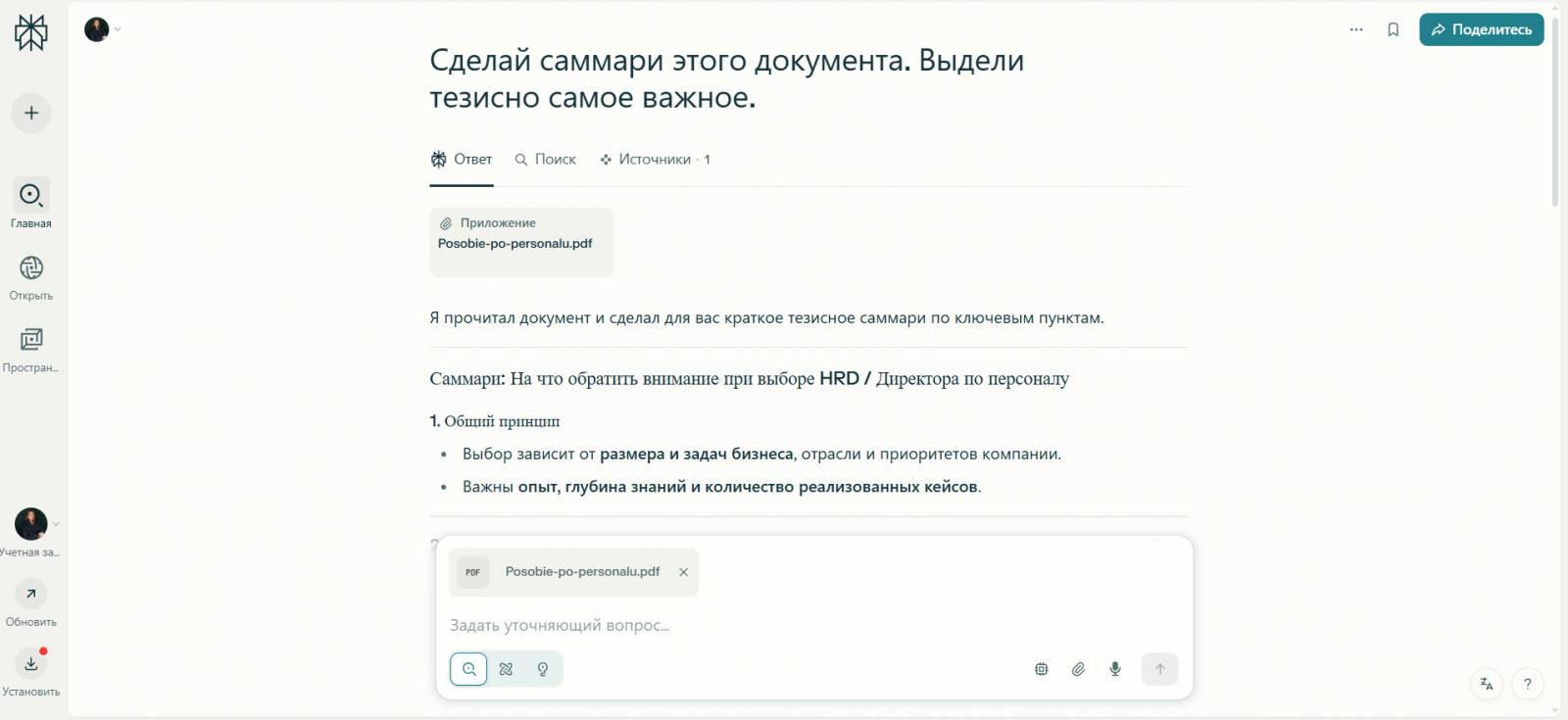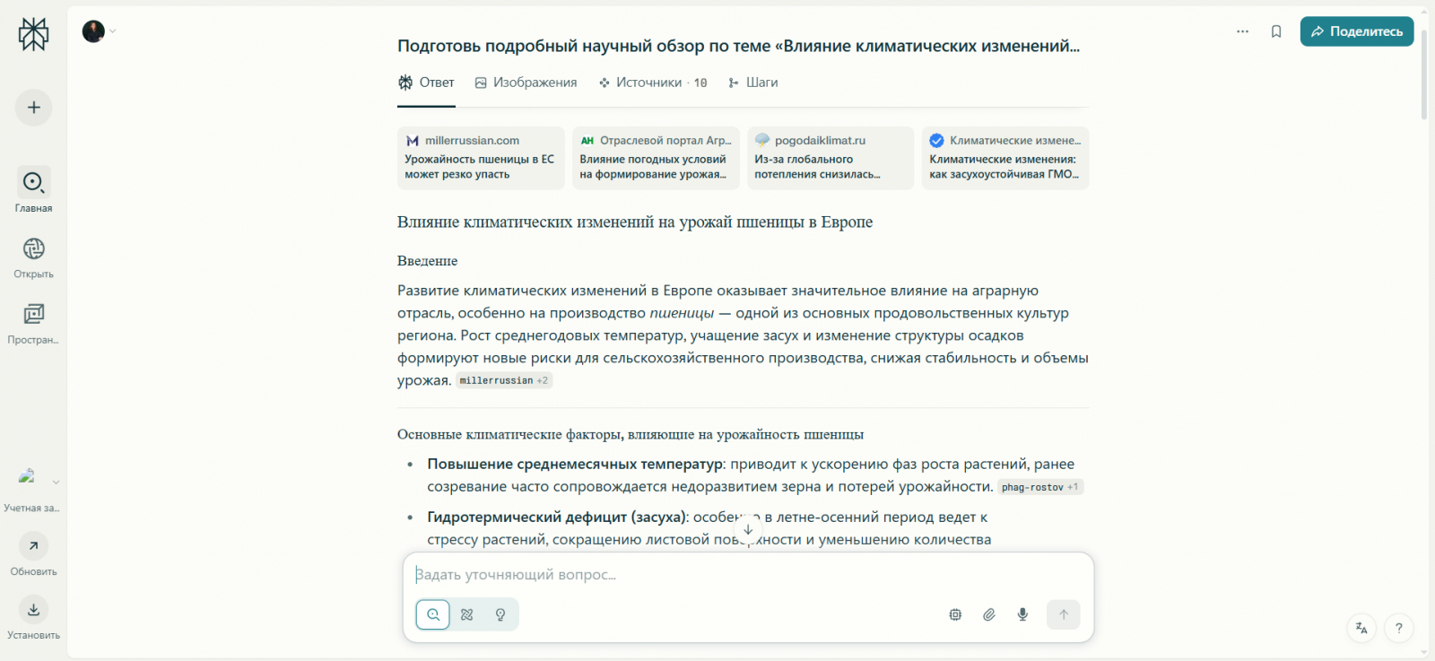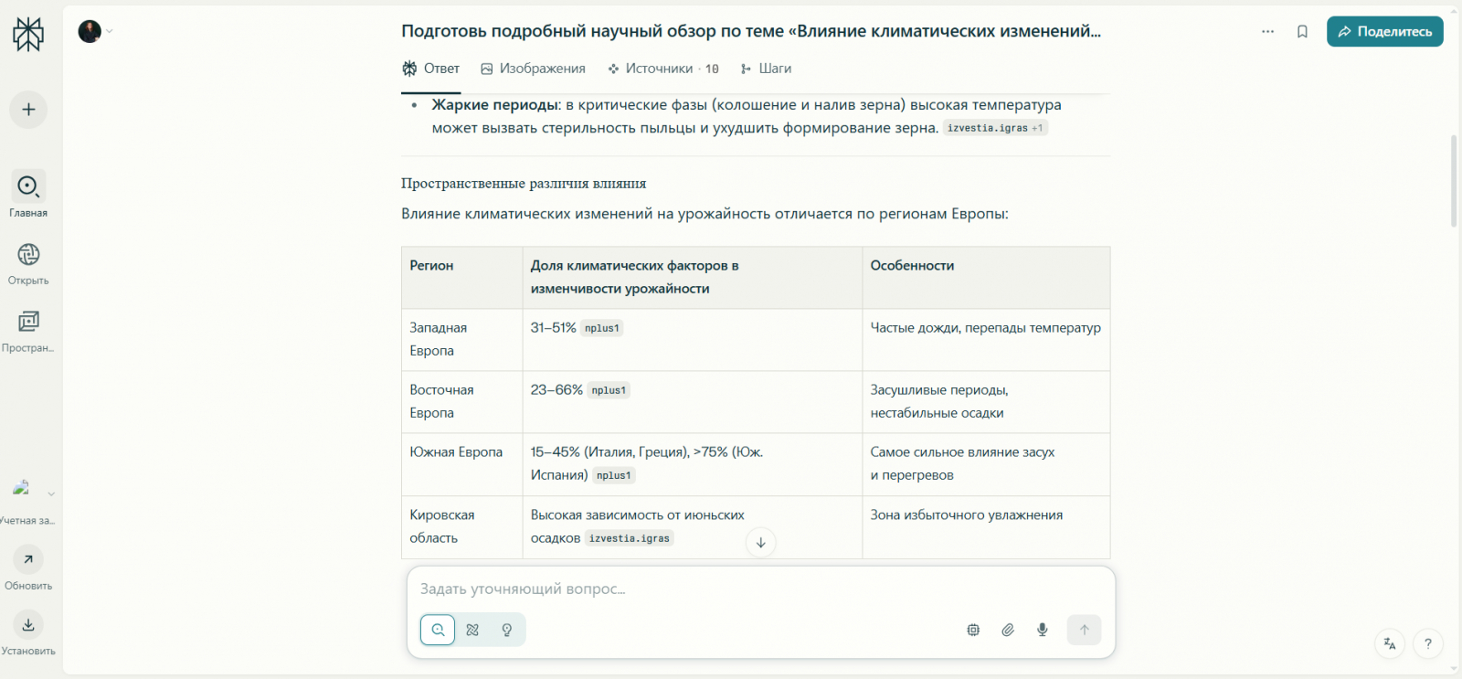 Perplexity AI понимает вопросы на русском, причем как краткие, так и развернутые. Например, можно спросить: «Что такое искусственный интеллект?» или дать более детальный запрос: «Объясни принцип работы искусственного интеллекта простыми словами для новичка». Чем точнее сформулирован запрос, тем лучше будет ответ. Советуем указывать контекст — для кого предназначена информация (студент, профессионал) и в каком формате ее представить (список, таблица, краткое объяснение). После отправки запроса Перплексити может задать уточняющие вопросы, чтобы лучше понять, что именно нужно пользователю. Например, если спросить «Что такое Python?», сервис может предложить сравнить его с другим языком программирования или рассказать о его применении в конкретной сфере. Эти уточнения помогают углубиться в тему: достаточно кликнуть на интересующий вариант, и система выдаст новый ответ, сохранив контекст прошлого обсуждения. Помимо текстовых запросов, Perplexity AI умеет анализировать загруженные файлы (PDF, DOCX) и видео с YouTube. Например, можно загрузить научную статью и попросить сделать краткое резюме или вставить ссылку на лекцию и спросить о ее ключевых тезисах. В бесплатной версии количество таких операций ограничено: до трех в день. Рассмотрим, как можно использовать Перплексити на практике. Все примеры были составлены в бесплатном режиме. Запрос: «Составь рейтинг топ-5 сервисов для просмотра кино. Расскажи, что это за сервис, когда был создан, сколько человек им пользуются и какие у него преимущества». Как отвечает Perplexity AI: Запрос: «Подготовь подробный научный обзор по теме „Влияние климатических изменений на урожай пшеницы в Европе“ в академическом стиле с таблицами». Как отвечает Perplexity AI: Запрос: «Предположим, что я готовлюсь к собеседованию на позицию HR-директора. Мне нужно потренироваться вести диалог с HR. Задавай мне вопросы, которые чаще всего задают в крупных компаниях, я буду отвечать на них, а ты дай оценку ответу и посоветуй, как улучшить мои ответы». Как отвечает Perplexity AI: Также можно попросить улучшить ответы и сделать их короче, профессиональнее, точнее. Обычный запрос: «как приготовить креветки». Как отвечает Perplexity AI: Запрос: «Сделай саммари этого документа. Выдели тезисно самое важное» (к запросу прикрепляется файл). Как отвечает Perplexity AI: Чем заменить Perplexity AI? Для текстовых ответов подойдут ChatGPT, Google Gemini или Claude, а для изображений — Recraft, Flux или Ideogram. Работает ли на русском языке? Да, сервис воспринимает запросы на русском и формирует ответы на этом же языке. Материалы из иностранных источников Перплексити переводит автоматически. Можно ли использовать Perplexity совместно? Да, отдельные ветки (Threads) можно объединять в коллекции (Collections), которые можно оставить приватными или открыть для совместного редактирования с другими пользователями. Результатами поиска легко делиться через кнопку Share. Собирает ли Перплексити мои данные? Да, инструмент сохраняет историю запросов и результаты поиска, чтобы улучшать качество ответов. Но при желании вы можете отключить использование личных данных в настройках.