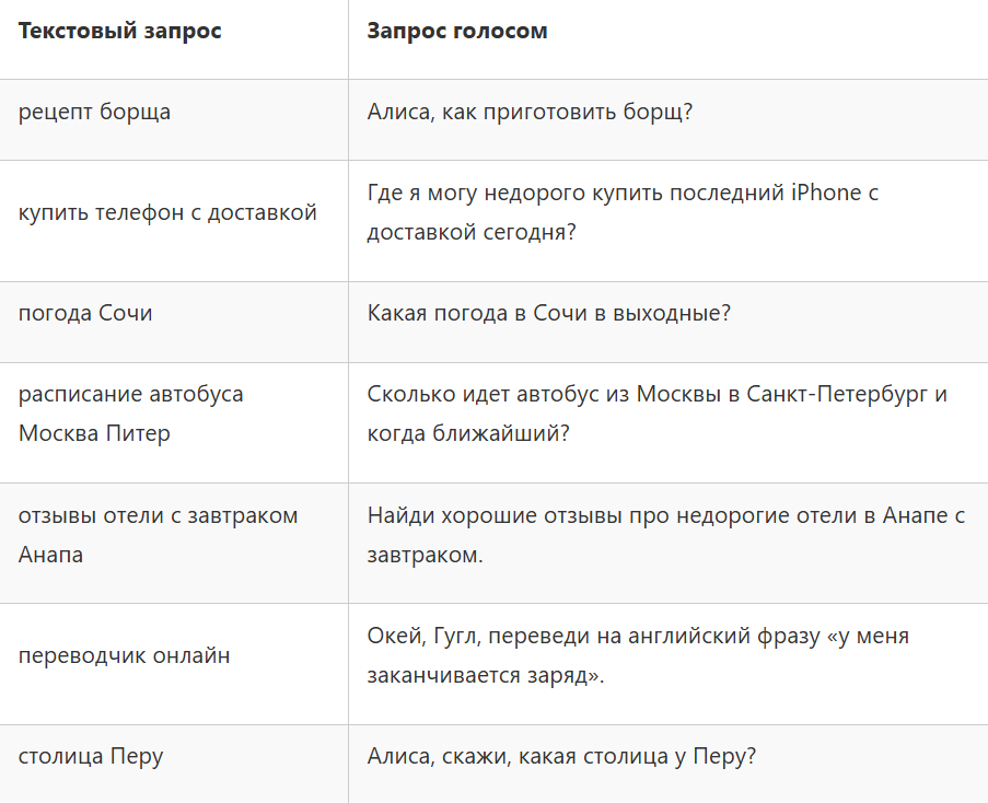 На изображении ниже — общее число пользователей цифровых голосовых ассистентов в мире в период с 2019 по 2024 год (в миллиардах). Ожидается, что к 2030 году рынок голосовых технологий вырастет до 26,8 миллиардов долларов. Компаниям уже сейчас важно задуматься о том, как их сайты будут отвечать на запросы голосом. Сразу скажу: не для каждого. Ключевой вопрос: ищут ли клиенты ваши товары или услуги с помощью голоса? То есть предложение бизнеса должно совпадать с форматом и целями запросов голосом. Основа голосового поиска — запросы с привязкой «рядом со мной». Люди спрашивают: «где купить цветы недалеко от меня», «ближайшая кофейня» или «вызвать сантехника срочно». Алгоритмы поисковиков отдают приоритет географической близости бизнеса, а не его рейтингу или ассортименту. Кому необходима оптимизация: Здесь акцент смещается с «где найти» на «что купить» и «что заказать». Помощники вроде Amazon Alexa научились управлять покупками: добавлять товары в корзину, оформлять заказы и давать персональные рекомендации. Такой шопинг понравится клиентам, которые привыкли постоянно взаимодействовать с голосовыми помощниками. Люди используют голосовые, чтобы быстро узнать что-то: «как приготовить безе» или «что такое NFT». Это возможность привлечь трафик на экспертный контент. Кому подойдет: Рынок помощников постоянно растет и развивается. Рассмотрим основных игроков. Этот ассистент, разработанный корпорацией Apple, предустановлен на iPhone, iPad, Apple Watch и компьютеры Mac. Функционал включает отправку сообщений, установку напоминаний, поиск данных в сети и контроль над системами умного дома. Сильные стороны: Помощник от Google функционирует на платформе Android, умных колонках Google Home и других совместимых гаджетах. Он способен обрабатывать запросы, исполнять команды и взаимодействовать с экосистемой сервисов компании. Сильные стороны: Ассистент, созданный компанией Amazon для устройств серии Echo и прочей совместимой техники. С его помощью можно координировать работу умного дома, проигрывать музыкальные композиции, ставить таймеры и получать доступ к прочему контенту. Сильные стороны: Отечественный помощник, разработанный компанией Яндекс. Доступен на смартфонах под управлением iOS и Android, а также в фирменных станциях. Алиса умеет искать данные в сети, контролировать умный дом, сообщать актуальные новости и предлагать развлекательный контент, включая игры. Сильные стороны: Алиса уступает глобальным аналогам по функциональности. Иногда помощник от Яндекса может давать неточные ответы на сложные или многосоставные вопросы. Продукт компании VK, встроенный в одноименную социальную сеть и другие платформы. Маруся помогает находить информацию, создавать напоминания, управлять умными устройствами. Сильные стороны: Маруся проигрывает другим помощникам по количеству доступных интеграций и общему объему функций. Подписывайтесь на наш ВК и Телеграм, чтобы узнавать последние новости SEO и нейросетей, а еще подсматривать новые фишки продвижения. Ключевое отличие заключается в естественности. В речи мы формулируем свои желания не в виде набора ключевых слов, а в форме полных, развернутых вопросов. Визуально этот контраст выглядит так: Этот переход от лаконичных фраз к полным предложениям обусловлен самой механикой общения. Пользователь воспринимает устройство как собеседн