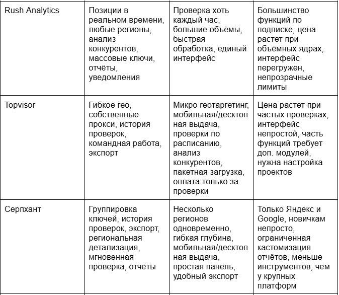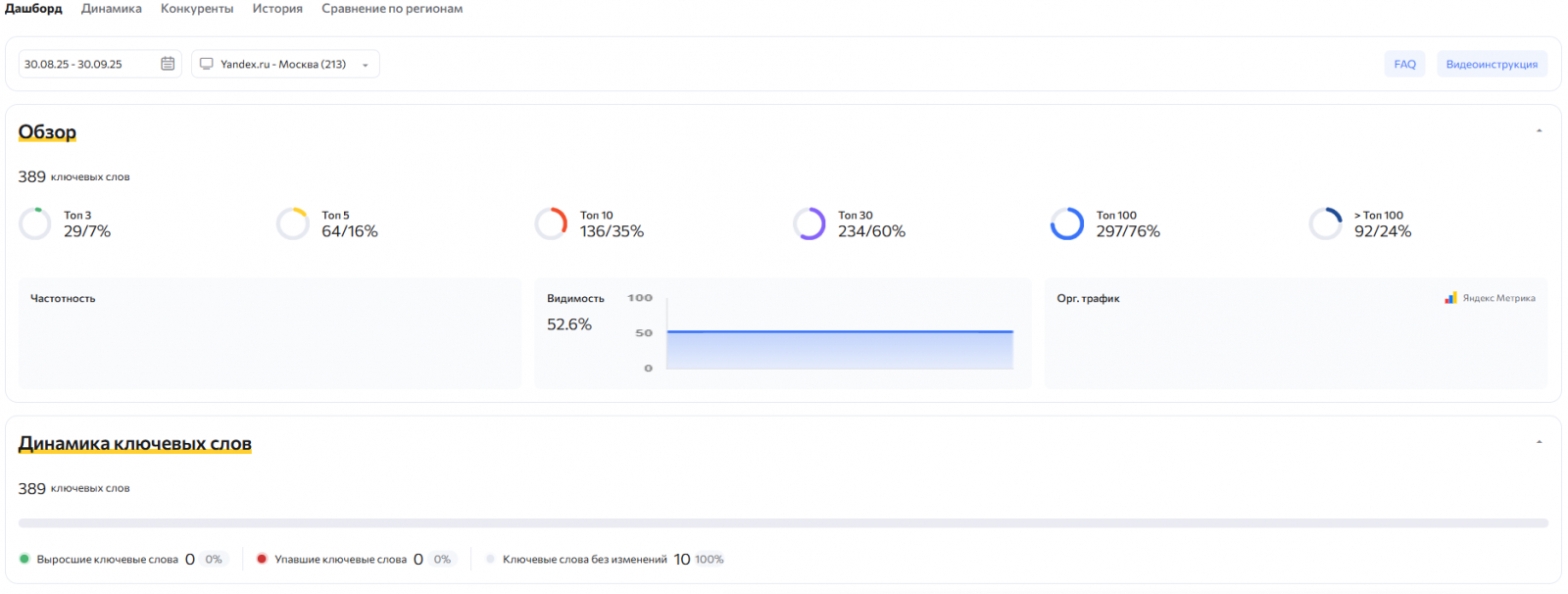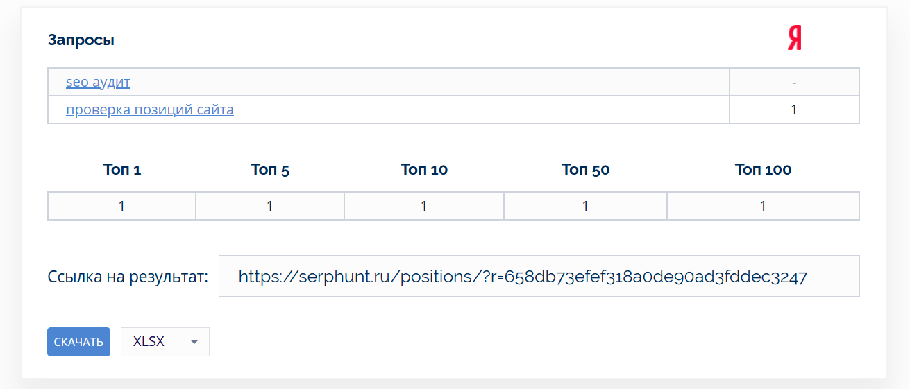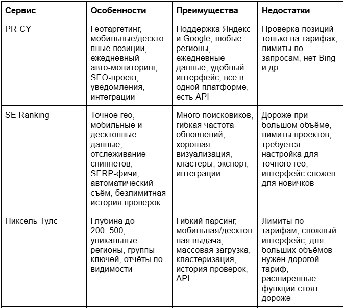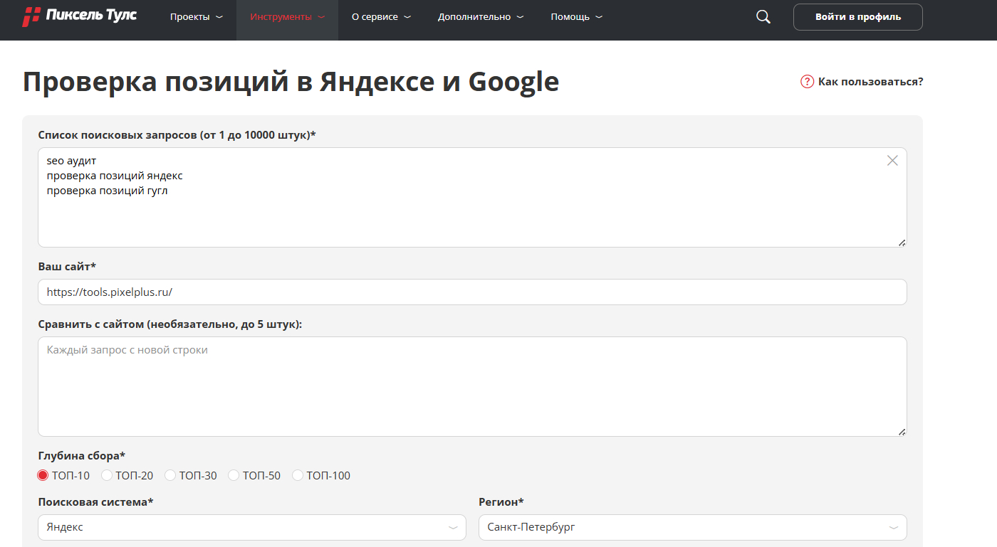 Это зависит от того, на каком этапе развития находится ваш проект. Конкретный график зависит от задач и состояния проекта, но для большинства сайтов комфортным считается мониторинг примерно два-три раза в месяц. Если хочется узнать, на каком месте ваш сайт появляется в поиске, сделать это можно прямо в браузере. Процедура довольно простая: откройте окно в режиме инкогнито, введите нужную фразу и пролистайте результаты, пока не увидите свой ресурс. Нашли? Зафиксируйте номер позиции. Затем можно повторить то же самое с другими запросами. Но такой способ проверки обычно быстро утомляет. Он отнимает много времени, не подходит для большого количества ключевых слов и совершенно не дает понимания, как меняются позиции со временем. Из‑за этого вручную отслеживать ранжирование в итоге становится неудобно. Поэтому большинство предпочитает пользоваться специальными сервисами. Они позволяют получить всю нужную информацию буквально за пару минут и дают гораздо более полную картину. Чтобы следить за положением сайта в поисковых системах, доступны разные инструменты. Есть бесплатные решения, например Яндекс.Вебмастер и Google Search Console. После подтверждения прав на сайт они помогают отслеживать основные показатели и дают базовое представление о видимости ресурса. Но у таких сервисов есть ограничения: они не показывают позиции в моменте и не позволяют анализировать конкурентов. Возможности Яндекс.Вебмастер Если же нужен глубокий анализ, регулярная проверка новых запросов, возможность сравнивать результаты с другими сайтами или выгружать данные, то стоит обратить внимание на платные инструменты. Они обеспечивают более широкие возможности и подходят для детальной работы с поисковой выдачей. PR-CY — это программная платформа для SEO-мониторинга и продвижения сайтов. Она помогает собирать, хранить и анализировать данные о позициях, ошибках сайта, трафике и спросе. Главная сайта PR-CY Проверка позиций в сервисе PR-CY SE Ranking помогает отслеживать позицию сайта в поисковых системах и понимать, насколько эффективно работает ваша SEO-стратегия. Он собирает данные по выбранным ключевым словам и показывает динамику изменений. Главная сайта SE Ranking Проверка позиций в сервисе SE Ranking Цены ориентировочные, так как на итоговую стоимость влияет количество ключевых слов, проектов и частота проверок. Стоимость указана при годовой подписке. Пиксель Тулс помогает следить за тем, как ваш сайт продвигается в поиске, и оценивать, насколько эффективно работает SEO. Он собирает данные о позициях по разным ключевым словам и учитывает результаты как для мобильных устройств, так и для компьютеров. Главная сайта Пиксель Тулс Проверка позиций в сервисе Пиксель Тулс Rush Analytics дает вам возможность отслеживать позиции сайта и конкурентов в режиме реального времени в Google и Яндекс во всех регионах. Частоту проверок можно выбрать самостоятельно. Главная сайта Rush Analytics Проверка позиций в сервисе Rush Analytics Topvisor помогает отслеживать продвижение сайта в поисковых системах и понимать, насколько хорошо работают SEO‑стратегии. Главная сайта Топвизор Проверка позиций в сервисе Topvisor Серпхант берет на себя рутинные задачи по мониторингу сайтов и помогает лучше понимать, что происходит с видимостью проекта в поиске. Он отслеживает динамику по ключевым запросам и анализирует поведение тра
