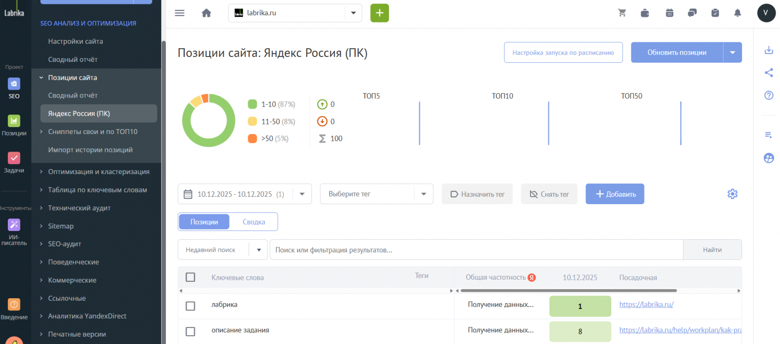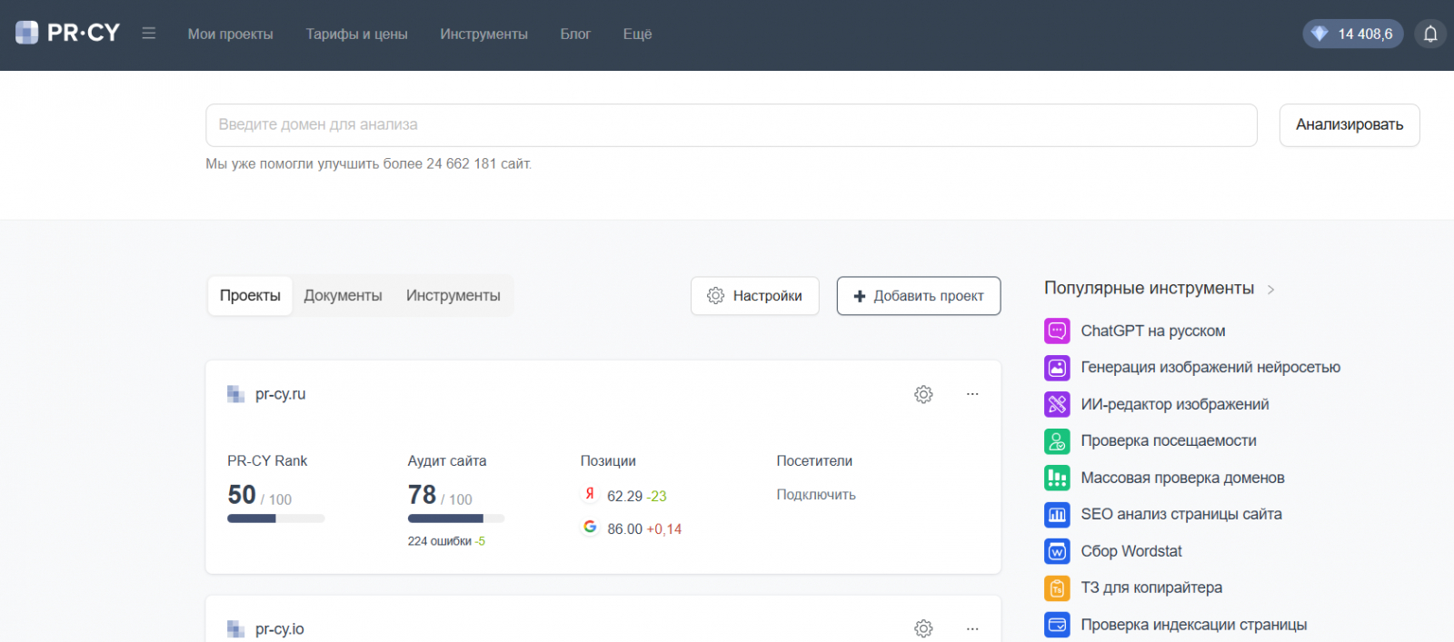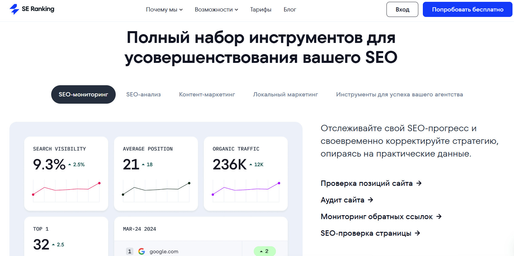 Это зависит от того, на каком этапе развития находится ваш проект. Конкретный график зависит от задач и состояния проекта, но для большинства сайтов комфортным считается мониторинг примерно два-три раза в месяц. Если хочется узнать, на каком месте ваш сайт появляется в поиске, сделать это можно прямо в браузере. Процедура довольно простая: откройте окно в режиме инкогнито, введите нужную фразу и пролистайте результаты, пока не увидите свой ресурс. Нашли? Зафиксируйте номер позиции. Затем можно повторить то же самое с другими запросами. Но такой способ проверки обычно быстро утомляет. Он отнимает много времени, не подходит для большого количества ключевых слов и совершенно не дает понимания, как меняются позиции со временем. Из‑за этого вручную отслеживать ранжирование в итоге становится неудобно. Поэтому большинство предпочитает пользоваться специальными сервисами. Они позволяют получить всю нужную информацию буквально за пару минут и дают гораздо более полную картину. Чтобы следить за положением сайта в поисковых системах, доступны разные инструменты. Есть бесплатные решения, например Яндекс.Вебмастер и Google Search Console. После подтверждения прав на сайт они помогают отслеживать основные показатели и дают базовое представление о видимости ресурса. Но у таких сервисов есть ограничения: они не показывают позиции в моменте и не позволяют анализировать конкурентов. Возможности Яндекс.Вебмастер Если же нужен глубокий анализ, регулярная проверка новых запросов, возможность сравнивать результаты с другими сайтами или выгружать данные, то стоит обратить внимание на платные инструменты. Они обеспечивают более широкие возможности и подходят для детальной работы с поисковой выдачей. PR-CY — это программная платформа для SEO-мониторинга и продвижения сайтов. Она помогает собирать, хранить и анализировать данные о позициях, ошибках сайта, трафике и спросе. Главная сайта PR-CY Проверка позиций в сервисе PR-CY SE Ranking помогает отслеживать позицию сайта в поисковых системах и понимать, насколько эффективно работает ваша SEO-стратегия. Он собирает данные по выбранным ключевым словам и показывает динамику изменений. Главная сайта SE Ranking Проверка позиций в сервисе SE Ranking Цены ориентировочные, так как на итоговую стоимость влияет количество ключевых слов, проектов и частота проверок. Стоимость указана при годовой подписке. Пиксель Тулс помогает следить за тем, как ваш сайт продвигается в поиске, и оценивать, насколько эффективно работает SEO. Он собирает данные о позициях по разным ключевым словам и учитывает результаты как для мобильных устройств, так и для компьютеров. Главная сайта Пиксель Тулс Проверка позиций в сервисе Пиксель Тулс Rush Analytics дает вам возможность отслеживать позиции сайта и конкурентов в режиме реального времени в Google и Яндекс во всех регионах. Частоту проверок можно выбрать самостоятельно. Главная сайта Rush Analytics Проверка позиций в сервисе Rush Analytics Topvisor помогает отслеживать продвижение сайта в поисковых системах и понимать, насколько хорошо работают SEO‑стратегии. Главная сайта Топвизор Проверка позиций в сервисе Topvisor Серпхант берет на себя рутинные задачи по мониторингу сайтов и помогает лучше понимать, что происходит с видимостью проекта в поиске. Он отслеживает динамику по ключевым запросам и анализирует поведение тра
