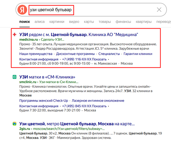 Также вы подбираете ключевое слово в зависимости от ниши. Если на условной Мясницкой находится салон красоты или медицинский центр — пользователь может забивать в поиск слова «врач, «салон», «клиника», «процедура», все виды услуг — «узи», «лифтинг», «консультация», «лечение кариеса»...
