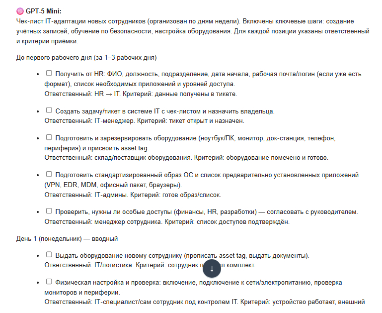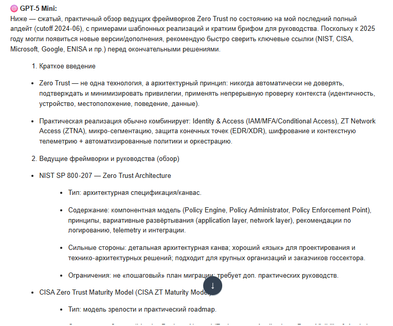 Я — архитектор по безопасности, работаю над внедрением модели zero trust. Исследуй ведущие фреймворки в 2024-2025 годах. По возможности включи примеры реализации zero trust. Предоставь сравнительный обзор и краткий бриф для моего руководства. ChatGPT помогает исследовать нормативы и оформлять документацию по оценке безопасности. Оценка законов о хранении данных по регионам Я планирую построить глобальную архитектуру хранения данных. Изучи требования к хранению данных в 2025 году для 3 самых крупных по населению регионов России. Укажи законодательные ограничения. Дай ссылки на официальные документы и представь результаты в таблице, сгруппированной по регионам. Анализ инструментов удаленного доступа Мне нужен безопасный и масштабируемый инструмент удаленного доступа для гибридной команды. Сравни топ текущих поставщиков для корпоративного использования в 2025 году. Удели внимание поддержке SSO, шифрованию, логированию сессий и ценам. Дополнительно представь краткий вывод со ссылками на первоисточники. Создание чек-листа соответствия На основе стандартов SOC 2 составь чек-лист IT-контроля для предстоящего внутреннего аудита. Используй этот документ как базу для подготовки к аудиту. Организуй пункты по доменам (например, доступ, управление изменениями, реагирование на инциденты). Проверка контроля доступа Изучи эту матрицу доступа с пользователями, ролями и системами. Проверь, соответствует ли уровень доступа каждого сотрудника принципу минимально необходимых прав. Определи возможные избыточные разрешения и представь таблицу пользователей, чьи права можно сократить. Анализ безопасности API Изучи эту схему API и пример набора логов трафика. Определи типичные уязвимости API — например, слабую валидацию входных данных или отсутствие аутентификации. Представь список найденных проблем с предложениями по их устранению. ChatGPT помогает разрабатывать политики управления активами, организацию онбординга и приоритизацию заявок. Создать чек-лист для онбординга Составь чек-лист для адаптации новых сотрудников с точки зрения IT. Включи ключевые шаги: создание учетных записей, обучение по безопасности, настройка оборудования. Используй этот план текущего процесса и представь чек-лист, организованный по дням недели. Разработать политику работы оборудования Создай проект для управления работой ноутбуков и компьютеров компании. Учти возраст устройств и текущие затраты на замену. Напиши рекомендации по срокам замены и по ее стоимости. Создать политику учета IT-активов Напиши официальный документ о поддержании и аудите инвентаризации IT-активов. Воспользуйся этим списком инструментов, отделов и ответственных лиц как отправной точкой. [вставьте список] Укажи цель, обязанности и процесс сверки инвентаризации. Приоритизировать IT-заявки Изучи очередь из открытых заявок IT-поддержки. Используй шкалу приоритетов, основанную на серьезности проблемы и срочности ее решения. Перестрой список в порядке приоритета и представь упорядоченный бэклог с кратким объяснением ранжирования каждой заявки. Отслеживать устаревшее оборудование Используй этот файл инвентаризации устройств с датами покупки, моделями и версиями ОС. [вставьте файл] Определи устройства, срок службы которых истек или близок к концу. Составь таблицу этих устройств с рисками дальнейшего исполь
