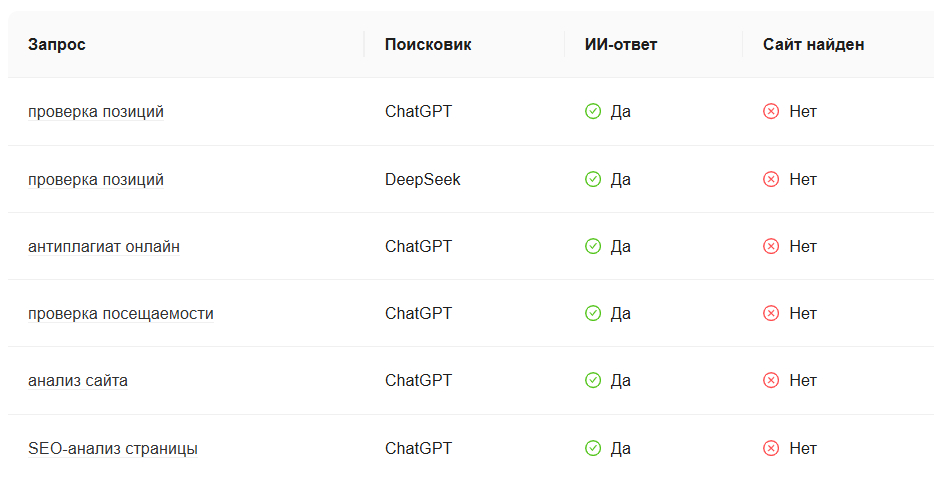 При этом путь к информации больше не ограничен одной точкой входа. Пользователь может начать поиск с ролика на YouTube, продолжить его в ИИ‑чате или в ВК и лишь потом — если это вообще понадобится — перейти на сайт. Поэтому SEO больше нельзя строить только вокруг Яндекса и Google. Самое заметное влияние ИИ‑поиска — рост поиска без переходов. Но под поверхностью происходит еще более серьезный сдвиг. Если пользователь все же переходит на сайт, он делает это уже с большей осознанностью: ИИ отфильтровал все лишнее и сформировал его ожидания. Кликов становится меньше — но каждый из них становится куда более ценным. Это меняет саму конкуренцию в SEO. Теперь речь идет не о том, чтобы быть «первым среди десяти синих ссылок», а о том, чтобы быть достаточно надежным источником для появления в ИИ‑ответах. Сосредоточьтесь на контенте, который ИИ не сможет легко заменить Страница не должна пересказывать только общеизвестные факты — определения, базовые подборки, стандартные советы. Создавайте материалы, которые полезны самому ИИ, а не такие, которые он легко перепишет: Вместо «По каким ключевым словам должна ранжироваться эта страница?» спрашивайте «Почему ИИ‑ассистент захочет сослаться именно на нее?» Оптимизируйте структуру контента для ИИ Нейросети предпочитают контент, который можно легко понять, объяснить и использовать повторно: Статьи, которые объясняют причины, сравнивают варианты или помогают принять решение, работают лучше, чем тексты, которые просто пересказывают факты. Расширяйте свое присутствие за пределами сайта ИИ оценивает не отдельные страницы, а общий контекст. Если бренд или эксперты часто упоминаются в статьях, подкастах, сообществах, видео или соцсетях, это формирует доверие еще до анализа конкретной страницы. Поэтому важна последовательная и естественная дистрибуция контента. Если название бренда регулярно встречается в нужных обсуждениях, ИИ начинает воспринимать его как авторитет. Переосмыслите те стратегии, которые считали успешными Для ИИ‑поиска чистый органический трафик становится менее значимым. На первый план выходят другие показатели: Становится все важнее отслеживать, попадает ли ваш сайт в ИИ-выдачу по нужным вам запросам. В этом вам может помочь инструмент для анализа ИИ-ответов. Сервис покажет наличие ИИ-ответа, проверит представленность вашего сайта и бренда в источниках ответов, определит позицию домена, а также выведет топ доменов и URL, которые наиболее часто упоминаются в ИИ-ответах. Много лет подряд концепция E‑E‑A‑T считалась важной, но на практике часто оставалась без внимания. Сейчас ситуация меняется. Поисковые системы столкнулись с кризисом доверия. Интернет переполнен материалами, которые выглядят аккуратно, грамотно и формально «правильно», но при этом не показывают, что за ними стоит реальный человек с реальным опытом. ИИ хорошо умеет пересказывать информацию, но не может похвастаться реальным опытом. Нейросеть не может доказать, что действительно выполняла работу, решала настоящие задачи или сталкивалась с последствиями своих решений. Поэтому поисковики и ИИ‑системы отдают приоритет контенту, где человеческий опыт не подразумевается, а очевиден. Это хорошо заметно по изменениям в выдаче: статьи от конкретных авторов обгоняют анонимные материалы и легче проходят обновления а