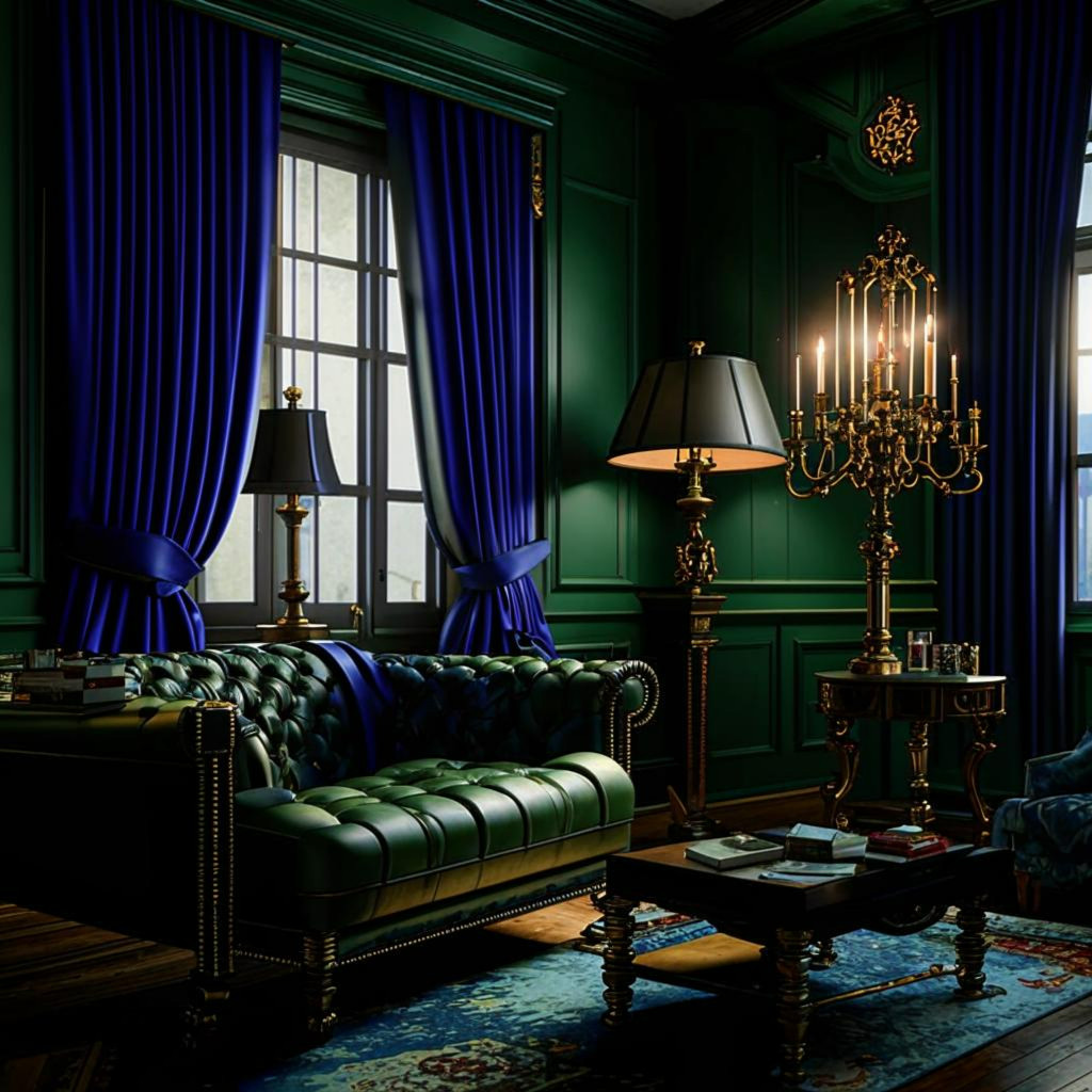 В интерьере «à la Depp» доминируют насыщенные, глубокие цвета: бордо, тёмно-зелёный, сапфирово-синий, тёплый шоколад, тёмный графит. Не бойтесь использовать чёрный, особенно в деталях или текстиле — он здесь уместен и даже необходим. Эти цвета отлично сочетаются с состаренным деревом, кожей, бархатом, металлом с налётом времени.