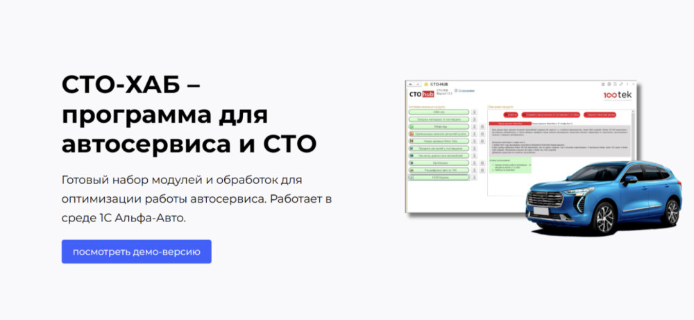 Модуль СТО-ХАБ от СТОТЕК — готовое решение, которое интегрируется в вашу существующую систему учета на базе конфигурации Альфа-Авто от 1С и значительно упрощает работу автосервиса. Он предлагает широкий функционал, который охватывает все ключевые аспекты работы автосервиса.