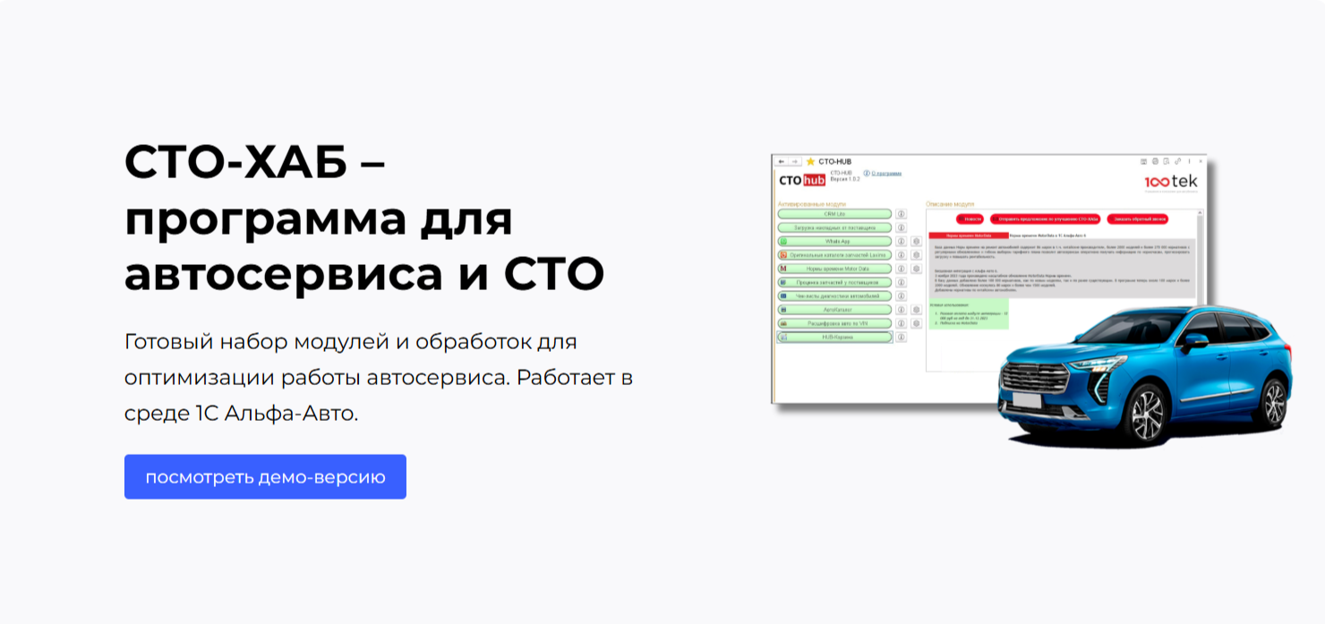 Все это занимает считанные минуты, что значительно повышает удовлетворенность клиента. Кроме того, модуль позволяет автоматически формировать отчеты о выполненных работах, напоминать клиентам о необходимости технического обслуживания и даже отправлять уведомления через мессенджеры, такие как WhatsApp и Telegram. Это не только экономит время, но и помогает удерживать клиентов, предлагая им высокий уровень сервиса. Модуль СТО-ХАБ включает в себя множество функций, которые делают его незаменимым инструментом для автосервиса. Среди них: Компания СТОТЕК специализируется на разработке решений для автоматизации бизнеса, и их расширение для 1С уже успешно используется в множестве автосервисов. Преимущества модуля СТО-ХАБ включают гибкость, возможность адаптации под специфику вашего бизнеса, профессиональную поддержку при внедрении и настройке, а также доступную цену, что делает его привлекательным даже для небольших автосервисов. Организация эффективного рабочего пространства для оперативного поиска, качества, повышения скорости и улучшения коммуникации с клиентами в автосервисе — не только реально, но и необходимо для успешного ведения бизнеса. Модуль СТО-ХАБ от СТОТЕК предлагает готовое решение, которое поможет вам автоматизировать процессы, улучшить качество обслуживания и повысить эффективность работы. Если вы хотите узнать больше о модуле СТО-ХАБ для 1С — обращайтесь к специалистам СТОТЕК! Подробности на СТО-ХАБ