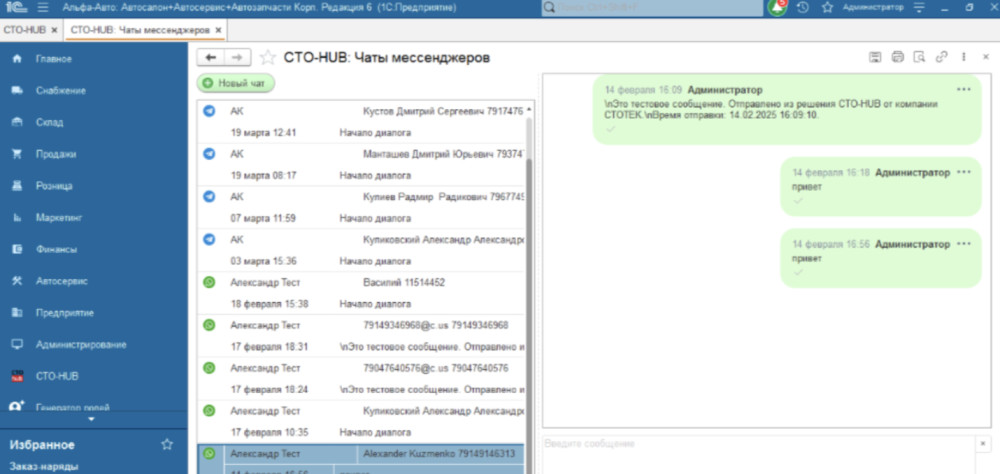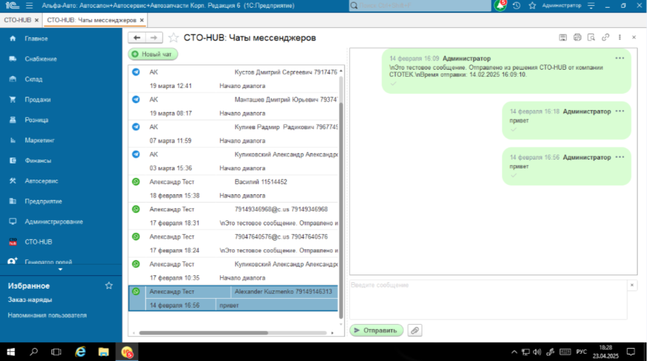 Представьте: вы сидите за компьютером, и вдруг клиент пишет в WhatsApp — оставляет заявку на ремонт. Это сообщение мгновенно появляется и в 1С Альфа-Авто, и в WhatsApp. Вы можете отвечать прямо из 1С, и все переписки синхронизируются: что написано в WhatsApp, отображается в 1С, и наоборот. Ничего не теряется, все под рукой! Удобно, быстро, без лишних переключений.