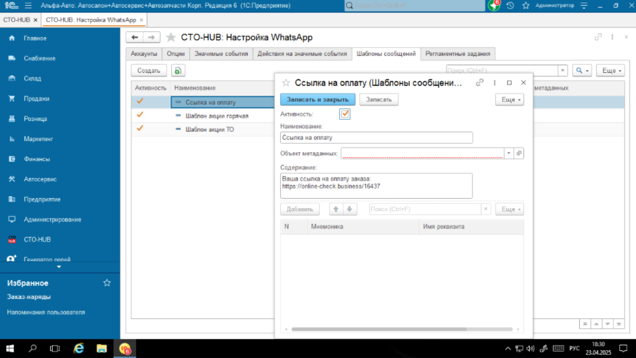 Автоматизация автобизнеса через модуль WhatsApp от СТО-ХАБ — простой и эффективный способ улучшить взаимодействие с клиентами и повысить эффективность работы. С этим решением вы сможете отправлять сообщения, вложения, шаблоны, значимые события и уведомления прямо из 1С, автоматизировать рутинные процессы и управлять клиентской базой более эффективно.