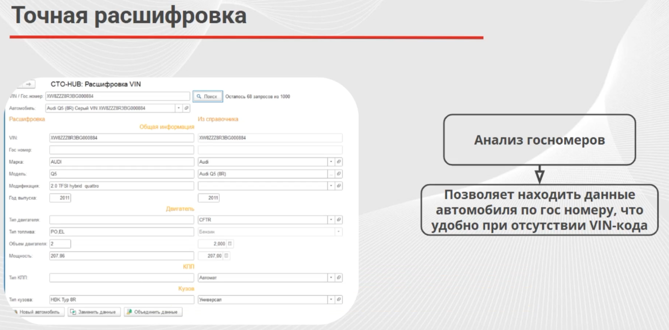 - Универсальность: Модуль работает как с VIN-кодами, так и с госномерами, что делает его универсальным инструментом для любого автосервиса.