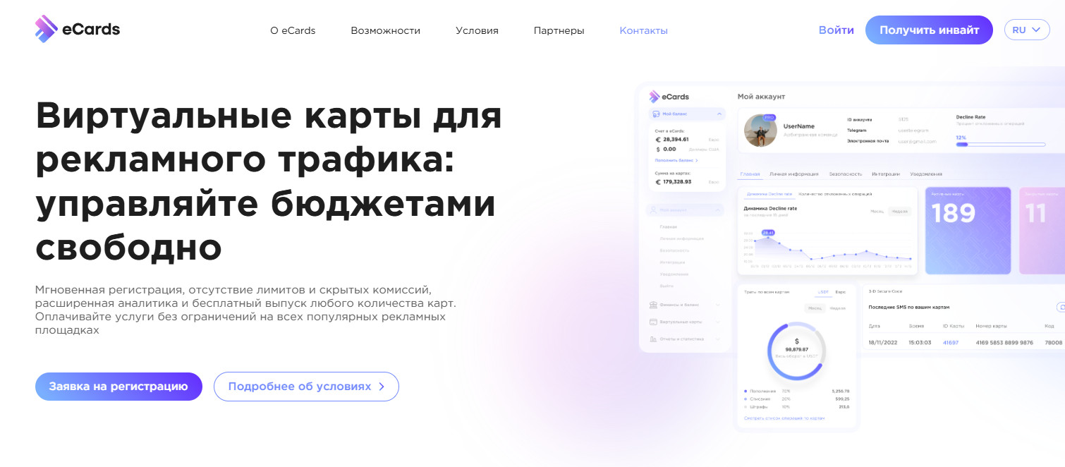Если вы работаете на объёмах и вам важны не только рекламные кампании, но и оплата околотеха — вроде нейросетей, прокси, хостингов — можно посмотреть в сторону Ecards. Карты платформы чаще всего проходят на крупных рекламных площадках. Плюс иногда цепляются и «вспомогательные» сервисы — не всегда, но попробовать можно.