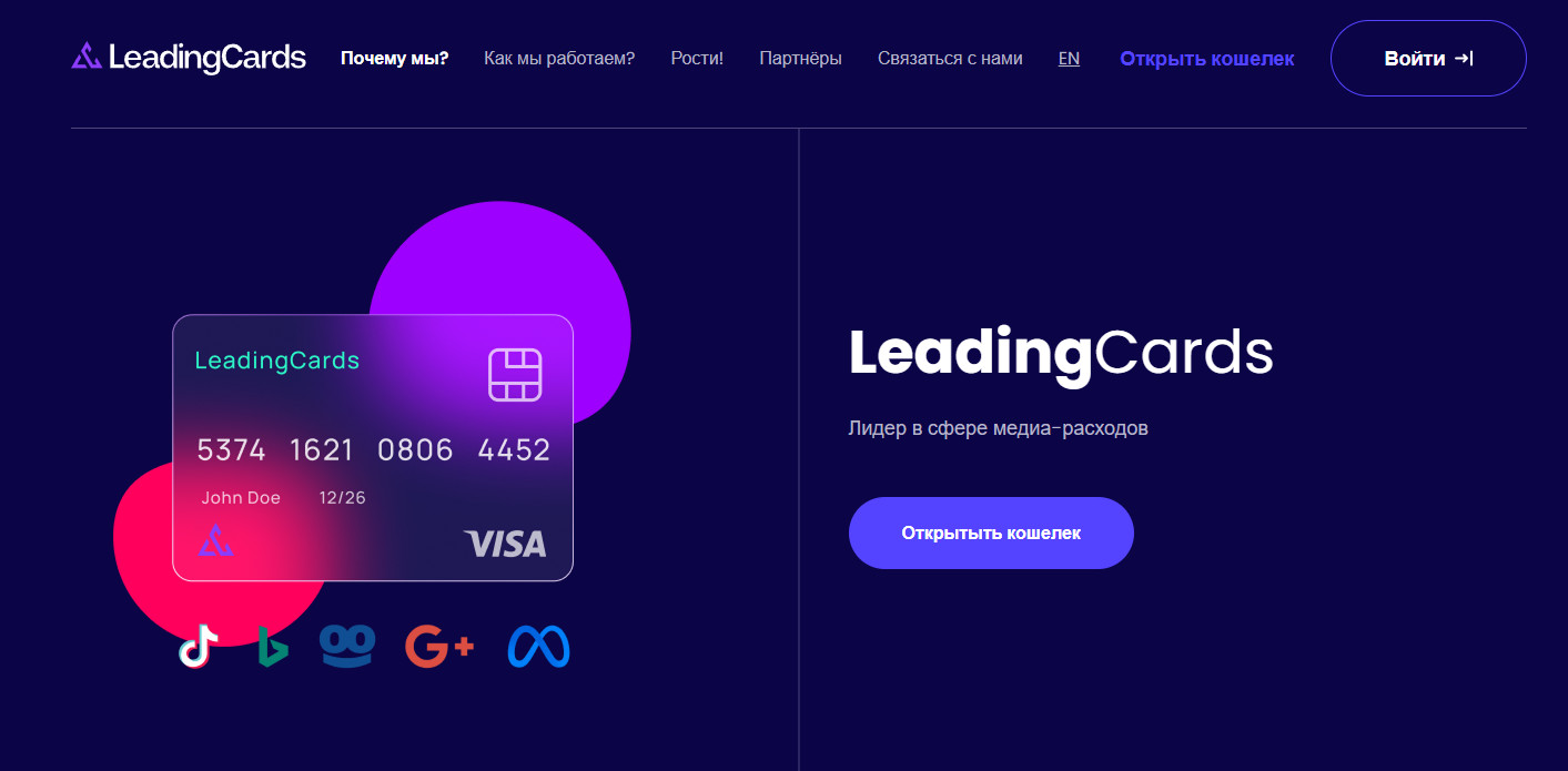 Leading Cards — виртуалки с фокусом на кастомизации адреса биллинга. Платить можно за разное, то есть платежка довольно универсальна. Бонусом можно подобрать вообще готовый рекламный акк. Цены и условия зависят от объема спенда и количества активных карт на момент расчета. Платежка ориентирована в основном тех, кто льет много и стабильно, а еще старомодно юзает платежку только для оплаты.