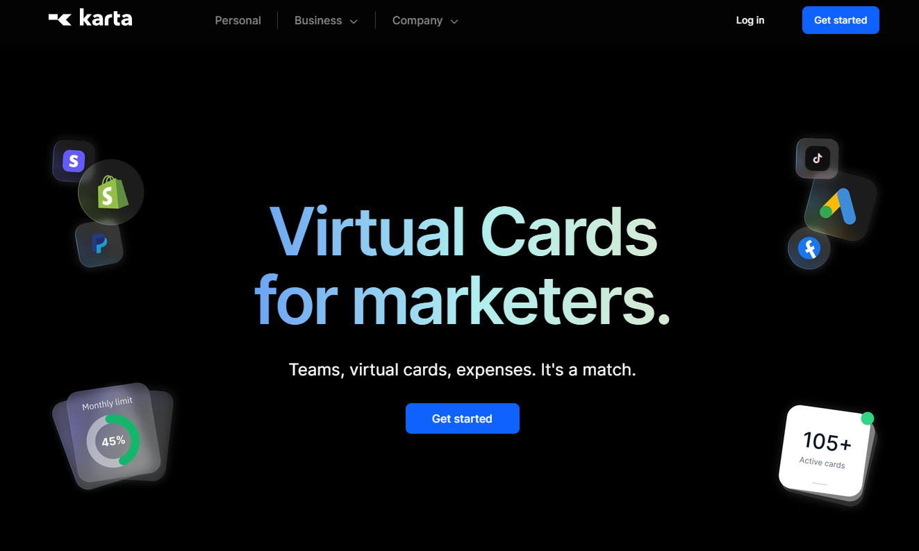 Karta.io — площадка для бизнес расходов, в том числе для рекламных. Стартовать можно только при спенде от $50 000 в месяц. А вот платить получится не везде. Для других площадок необходимо сверяться с актуальным списком мерчантов. Платежка идеально подойдет для команд с высоким трафиком, зарегистрированных в США.