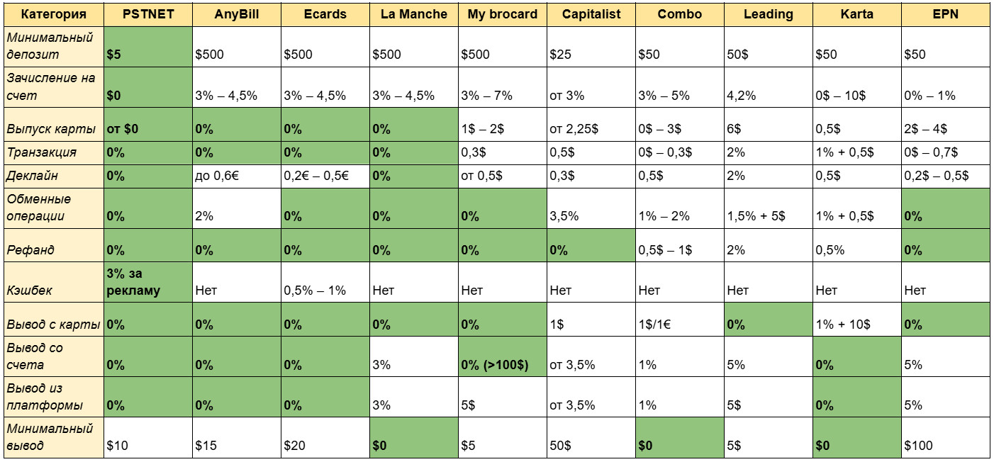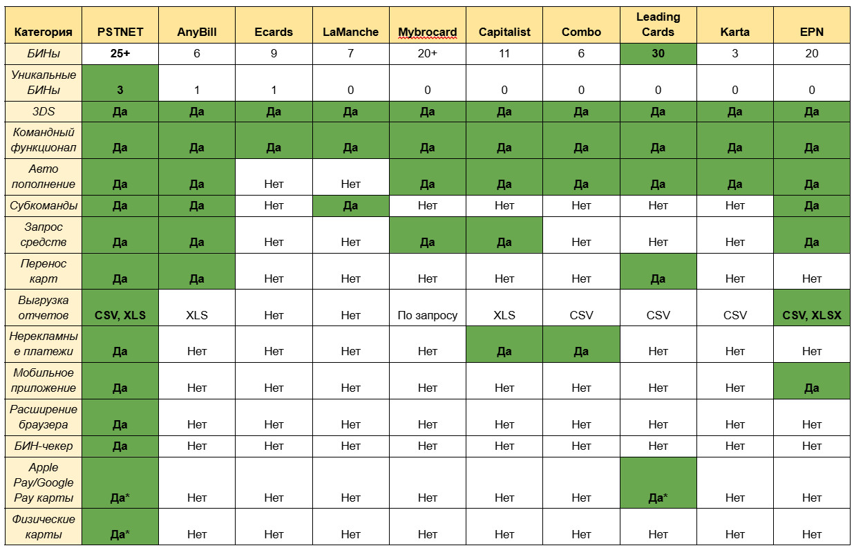 Все важные экономические показатели я упаковал в табличку. Ниже легко сравнить, сколько стоит выпуск карты у каждого сервиса, какое пополнение и лимиты на депозиты. Плюс за какие категории можно получать кэшбэк. По табличке видно, что первое место в моем рейтинге у PSTNET обосновано. Их условия сейчас объективно самые удобные для арбитража. Простая и понятная модель комиссий: почти везде ни за что не нужно доплачивать плюс много свободы действий, так как минималки действительно низкие. Опция выпуска бесплатных карт и стабильный кэшбэк 3% на рекламные расходы. Не «до 3%», не «на выборочных платформах», а реально 3% на весь трафик. Это ощутимая экономия, особенно при масштабировании. Второе место делят eCards, Abcard (AnyBill) и LaManche Payment. У них схемы чуть менее щедрые. eCards даёт кэшбэк на рекламу только большом спенде и максимум, который можно вернуть — это 1%. Зато сервисы радуют нулевыми комиссиями на операции. Но без нюансов не обошлось. У AnyBill, например, есть доплаты за обмены и отказы. А LaManche берёт за любые операции по выводу — что в долгосрочной перспективе может съедать часть прибыли. В целом, эти сервисы подойдут тем, кто готов вникать в детали и точно знает, где и как будет лить. Третью строчку делят карты Капиталист и Mybrocard. Местами их комиссии даже выгодные — например, за вывод и рефанды. Но за все другие операции придётся доплачивать. Суммы, конечно, в целом невелики, но на больших заливах ощутимые. Capitalist — довольно нишевый вариант для некоторых сценариев. При работе с платежкой WebMoney можно получить кэшбэк до 5% на пополнение. У Brocards ситуацию немного спасает возможность получать кешбэк за деклайны (от 30% до 100%) и за пополнение (от 0,1% до 0,5%). Дальше — Комбокардс. У них комиссии почти на всё: пополнение, вывод, обмен, возвраты. Зато размеры сборов всё-таки небольшие, да есть пара интересных бонусов. Например, они возвращают часть средств за неудачные попытки оплаты (до 100% от комиссии), а также дают кэшбэк за пополнение — пусть и скромный, от 0,1% до 0,5%. Для тех, кто любит выжимать максимум вполне неплохо. Пожалуй, самые спорные по условиям сервисы — это Karta, EPN и Leading cards. У первых двух комиссии есть практически на всё, пусть тоже и не самые большие. Но их количество в итоге серьёзно влияет на итоговую маржу. А вот Leading Cards — просто дорогие. Здесь почти каждая операция стоит денег, комиссии ощутимы, а если пользуешься криптой — готовься к дополнительной конвертации. Из плюсов — низкий порог входа в платформу, то есть депозит не превышает 50$. В общем, если не считать особо специфических кейсов, эти сервисы, мягко говоря, на любителя. С комиссиями разобрались. Теперь, поговорим про реальные задачи. На практике все решают детали: будут ли проходить платежи по картам, насколько удобно работать с платежкой в команде — есть ли автоматизация и прилка, например. И, конечно, какие еще полезные штуки у сервиса вообще есть. Я имею в виду, можно ли платить картами за нейросети и формирует ли платежка финансовую отчетность. Я протестировал платежки по всем функциям: от тех, что влияют непосредственно на покупку трафика до тех, что делают управление множеством карт комфортным. По итогу — еще табличка. Лидером по сочетанию выбора БИНов, их качества и дополнительных плюсов становится PSTNET. Пользователи получают более 25 БИНов, включая 3 уникальных, заточенных под оплату рекламы. Что о