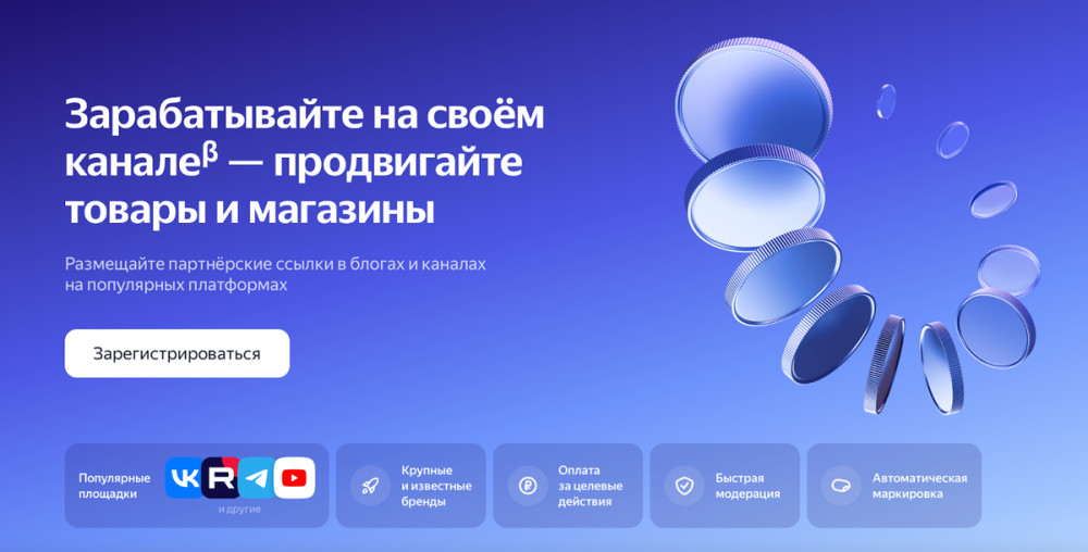 Автор Telegram-канала «Магия уютного дома» рассказал, что уже за первый месяц размещения партнерской рекламы через РСЯ доход составил половину всей предыдущей выручки канала. Монетизация от «Яндекса» идеально работает для: А еще — для всех, кто просто хочет протестировать новый способ заработка без риска и вложений. Для первых 1 000 блогеров предусмотрена дополнительная премия — до 20 000 рублей за 5 публикаций, которые наберут нужное количество показов и кликов. Условия — в Справке, а регистрация открыта уже сейчас. Сегодня каждый блогер может превратить свое увлечение в стабильный доход. Неважно, у вас 1 000 или 100 000 подписчиков — если вы знаете свою аудиторию и умеете интересно рассказывать, «Яндекс» поможет превратить ваш канал в источник прибыли. Просто выберите товар, напишите пост, разместите ссылку — и наблюдайте, как цифры в кабинете начинают расти.