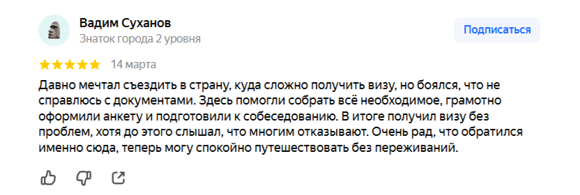 Вадим Суханов, клиент компании, поделился: «Давно мечтал посетить страну с жесткими визовыми требованиями. Специалисты не просто собрали документы, но и детально проработали мою анкету, провели имитацию собеседования. В результате визу одобрили без лишних вопросов, хотя до этого слышал много историй об отказах».