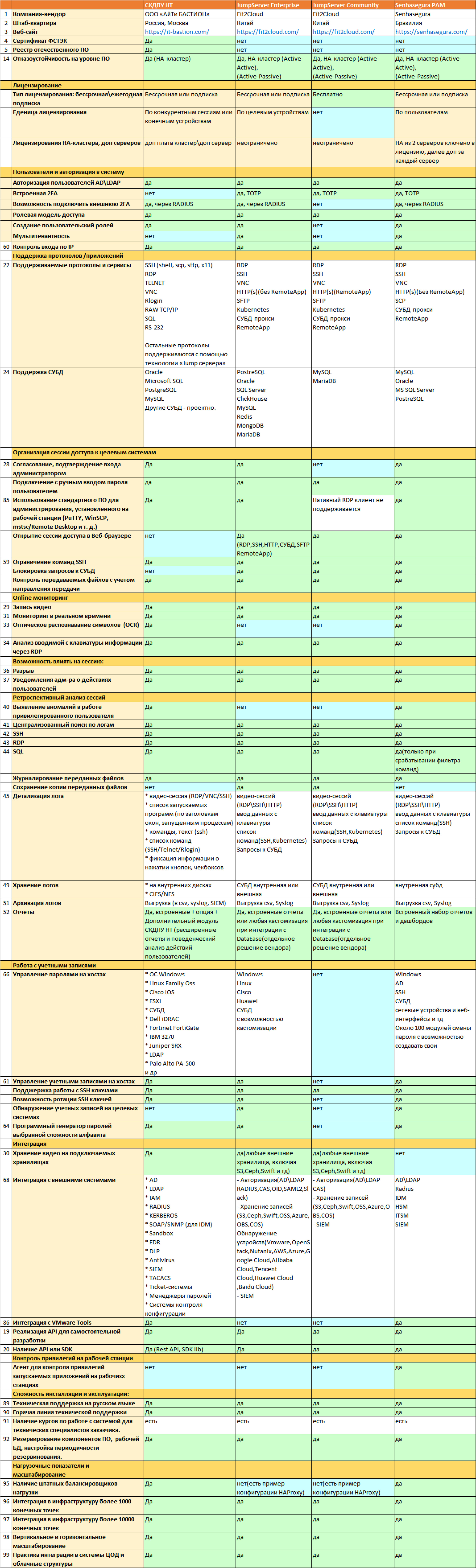 В этой таблице приведено сравнение трёх решений в области управления привилегированным доступом (PAM): СКДПУ, JumpServer и Senhasegura. Все три продукта предназначены для контроля, аудита и защиты доступа к критически важным ИТ-ресурсам, но различаются по архитектуре, уровню автоматизации, локализации и функциям.
